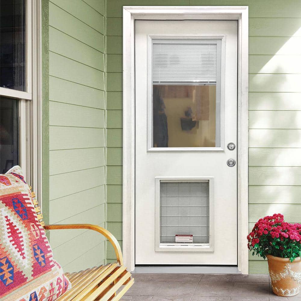 A durable fiberglass prehung exterior door featuring clear Low-E glass with integrated mini-blinds and an extra-large pet door. Primed white and pre-hung in a 4-9/16 in. frame for quick installation, it resists dents and weather while adding light and convenience.
