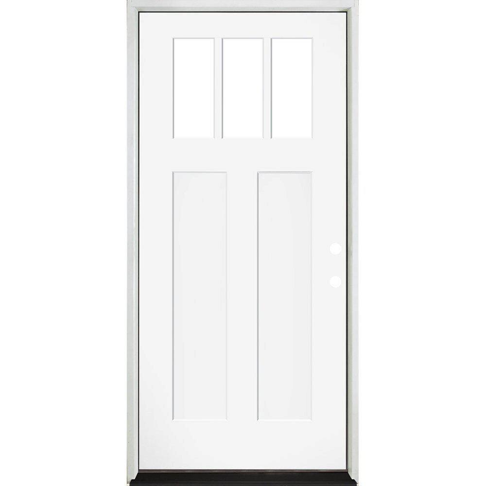 A durable, primed white fiberglass prehung front door with three clear toplites delivers classic style and energy efficiency. Built with a composite frame and Low-E double-glazed glass, it resists rot, warping, and drafts for long-lasting performance.