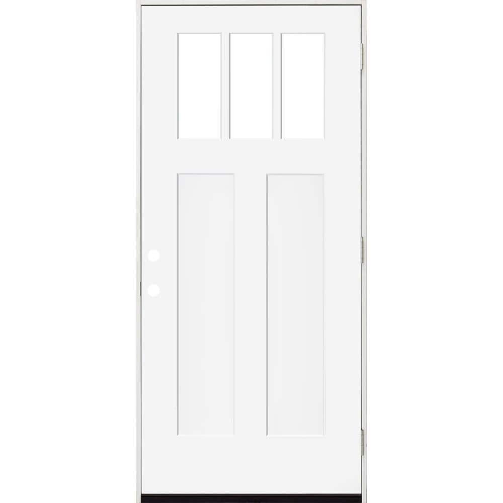 A durable, low-maintenance fiberglass front door prehung in a composite frame for long-lasting performance. Features 3 clear toplites with double-glazed Low-E glass for energy savings and a white primed finish ready to paint. Left-hand outswing configuration with ball-bearing hinges and weatherstripping for a tight seal.