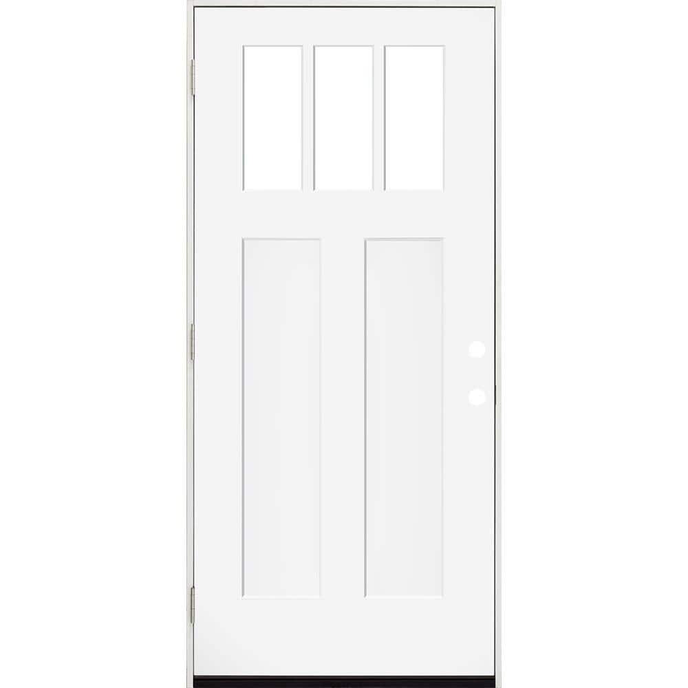 Energy-efficient fiberglass prehung front door with three clear toplites and a durable composite frame. Factory primed white, it resists denting, warping, and rot while Low-E double-glazed glass helps cut heating and cooling costs.