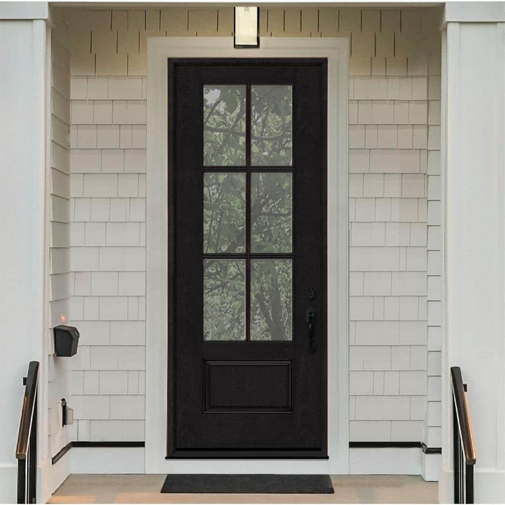 This door grounds the façade with a deep onyx tone and refined, mahogany-grain texture, instantly elevating curb appeal. The six-lite clear glazing adds an airy rhythm, balancing strength with light. Pair it with matte black hardware and warm exterior sconces to layer contrast and glow. A timeless statement, it’s a sophisticated essential for luxurious everyday living.