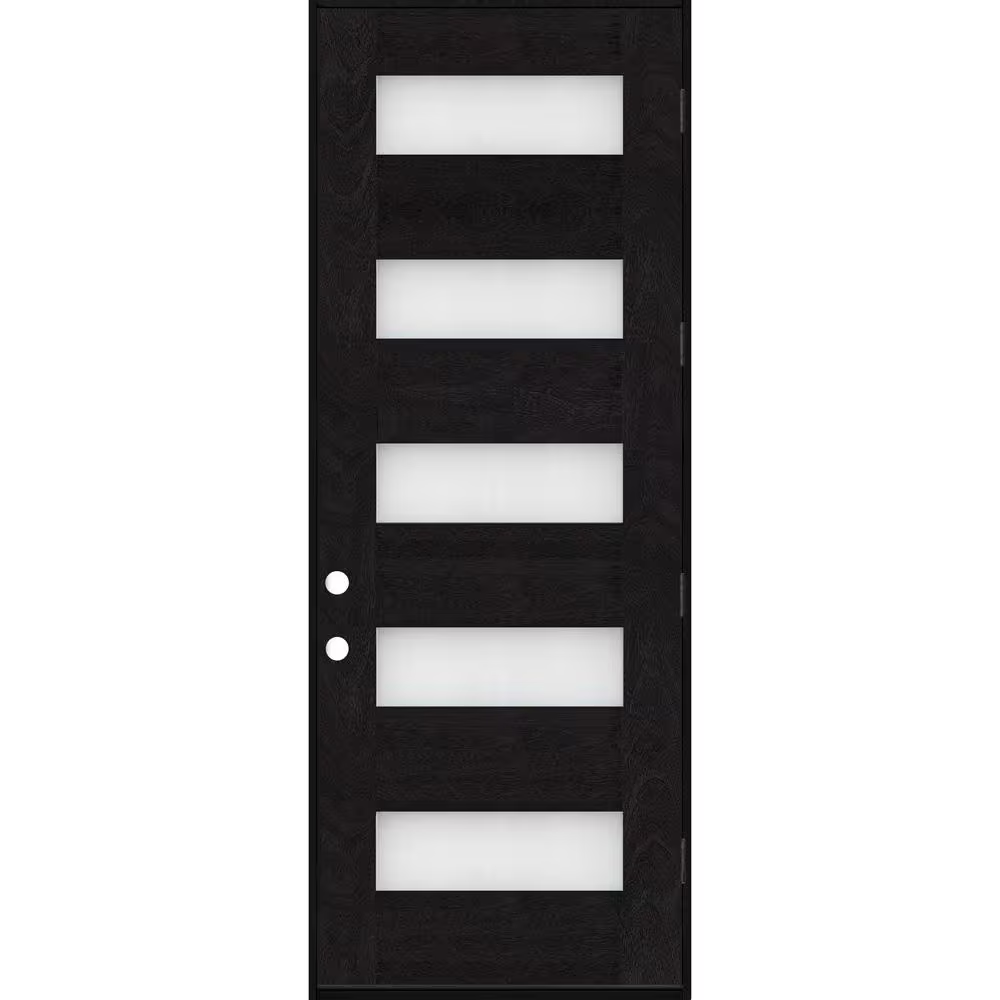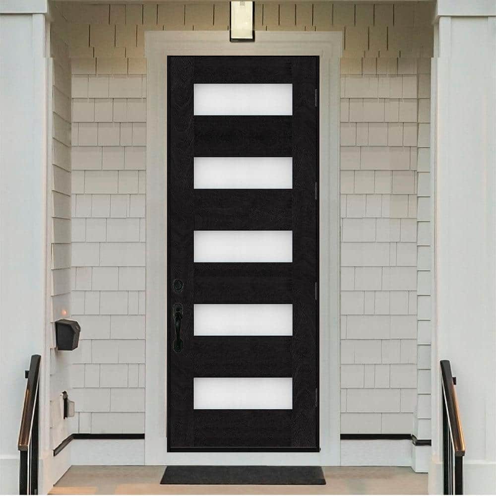 A modern, energy-efficient fiberglass front door featuring five frosted lites and an onyx-stained finish. Prehung with a composite, rot-free frame and ball-bearing hinges, it delivers durability, smooth operation, and elevated curb appeal.