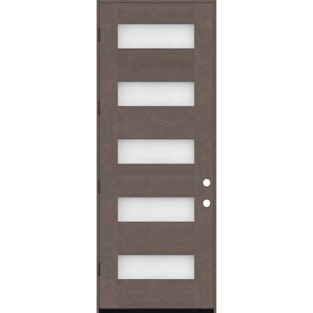 A modern, prehung fiberglass entry door featuring five horizontal opaque glass lites and an Ashwood stain. Built with a textured mahogany-grain surface, solid LVL edge, and polyurethane core for rot-free durability and energy efficiency.