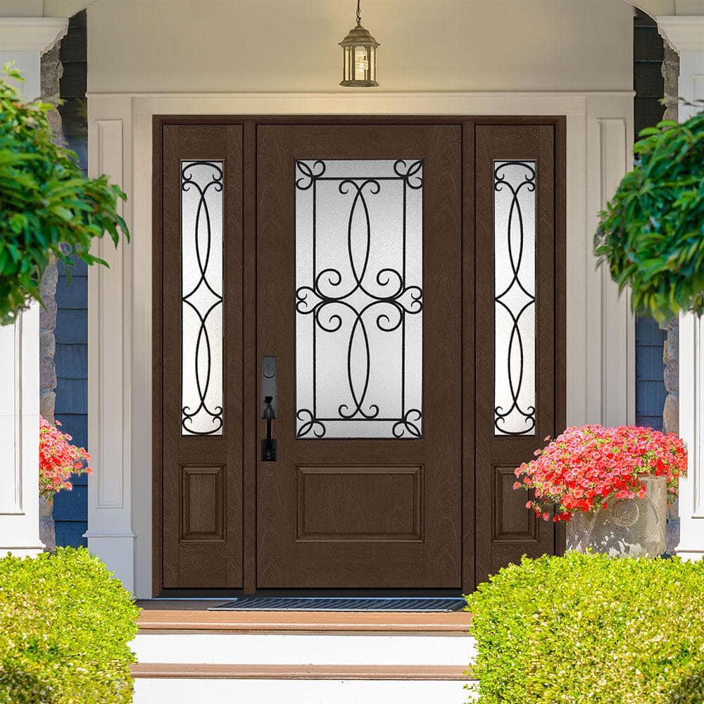 A prefinished fiberglass front door with rich hickory mahogany grain and Georgian decorative glass adds elegance and durability to your entryway. The rot-free composite frame, insulated polyurethane core, and low-E triple-pane tempered glass boost energy efficiency and security. Prehung with ball-bearing hinges and 12 in. sidelites for a seamless, easy install.