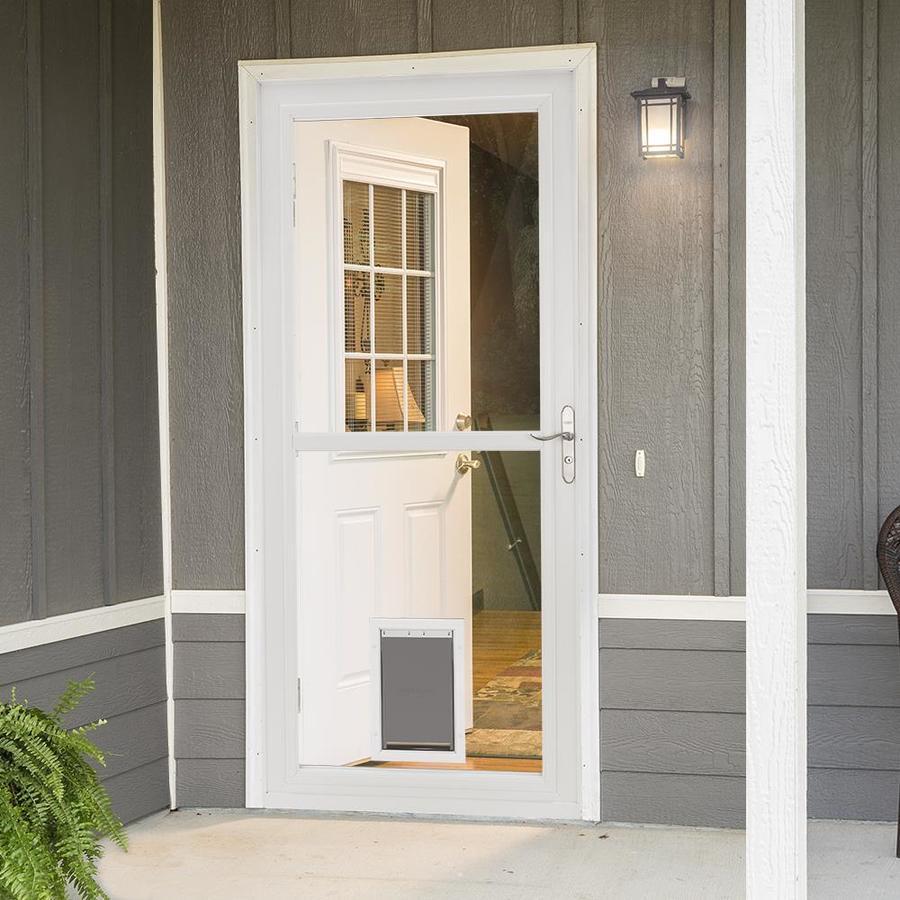 Retractable Screen Away® design converts storm door to screen door, hiding the screen in a cassette at the top of the door Factory installed 8-in x 12-in pet door accommodates pets up to 40 lbs; includes inside security panel QuickFit™ handle set (packaged separately from door box) features a modern design; keyed deadbolt lock provides enhanced protection Overlapping edge with dual weatherstrip offers the tightest seal for increased energy efficiency Heavy-duty 1-7/8-in thick frame construction stands up to heavy traffic Dependable 2-closer system with hold open feature allows hands-free operation; tap bottom button to hold door open; push door open slightly to release REVERSA-HINGE allows for right or left hinge mounting EasyHang® installation is faster and easier than traditional methods and offers a no-cut system with mounting rail extenders for an exact fit every time EasyHang™ installation is faster and easier than traditional methods and offers a no-cut system with mounting rail extenders for an exact fit every time