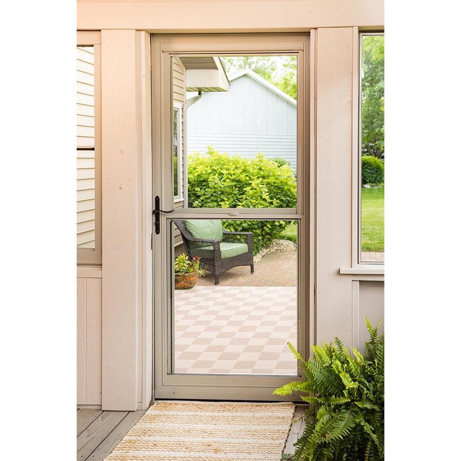 The 4-in-1 retractable screen provides superior privacy, better insect protection, enhanced solar protection and improved strength; screen hides in top cassette when not in use The revolutionary closing system is built into the frame and hidden out of sight at the top of the door providing a clean look inside and out; to release the closer just pull the door Hold the door open by pushing until you hear a click; to release just pull the door close Customize your door with a QuickFit™ handle set featuring modern designs and finishes; keyed deadbolt lock provides enhanced protection (sold separately) Overlapping edge with dual weatherstrip offers the tightest seal for increased energy efficiency Heavy-duty 1-7/8-in thick frame construction stands up to heavy traffic REVERSA-HINGE allows for right or left hinge mounting EasyHang® installation is faster and easier than traditional methods and offers a no-cut system with mounting rail extenders for an exact fit every time