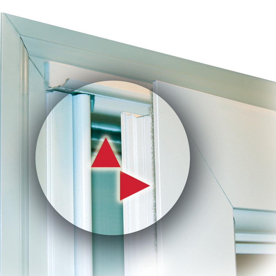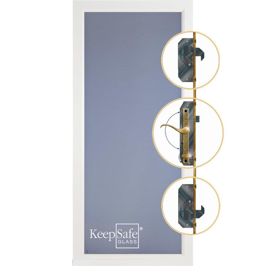 Engineered laminated inner layer glass acts as a protective shield and holds together even if the glass cracks Full glass design allows maximum natural light into home while blocking 99% of harmful UV rays Multi-point lock system secures door in 3 places for additional security 1-5/8-In thick heavy-duty, sturdy frame constructed with a maintenance-free aluminum finish Overlapping edge and dual weatherstripping seal out harsh weather and provide a tight seal to keep out drafts One-Way installation screws help prevent door removal from outside EasyHang® installation requires no cutting and includes mounting rail extenders and pre-drilled hinge locater holes to provide an exact fit every time REVERSA-HINGE allows for right or left hinge mounting The adjustable expander conforms to uneven sills for a tight fit