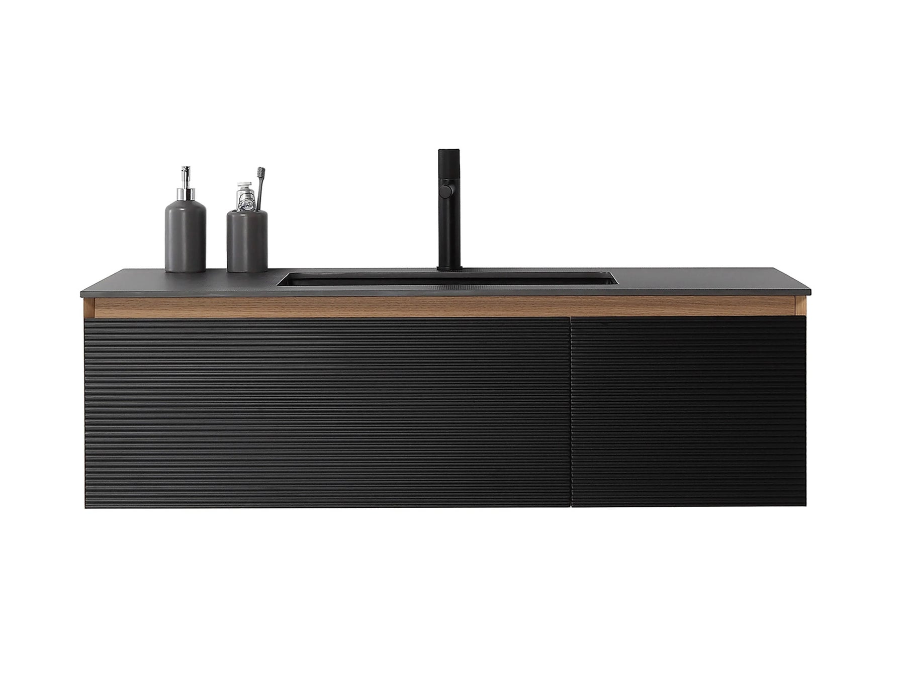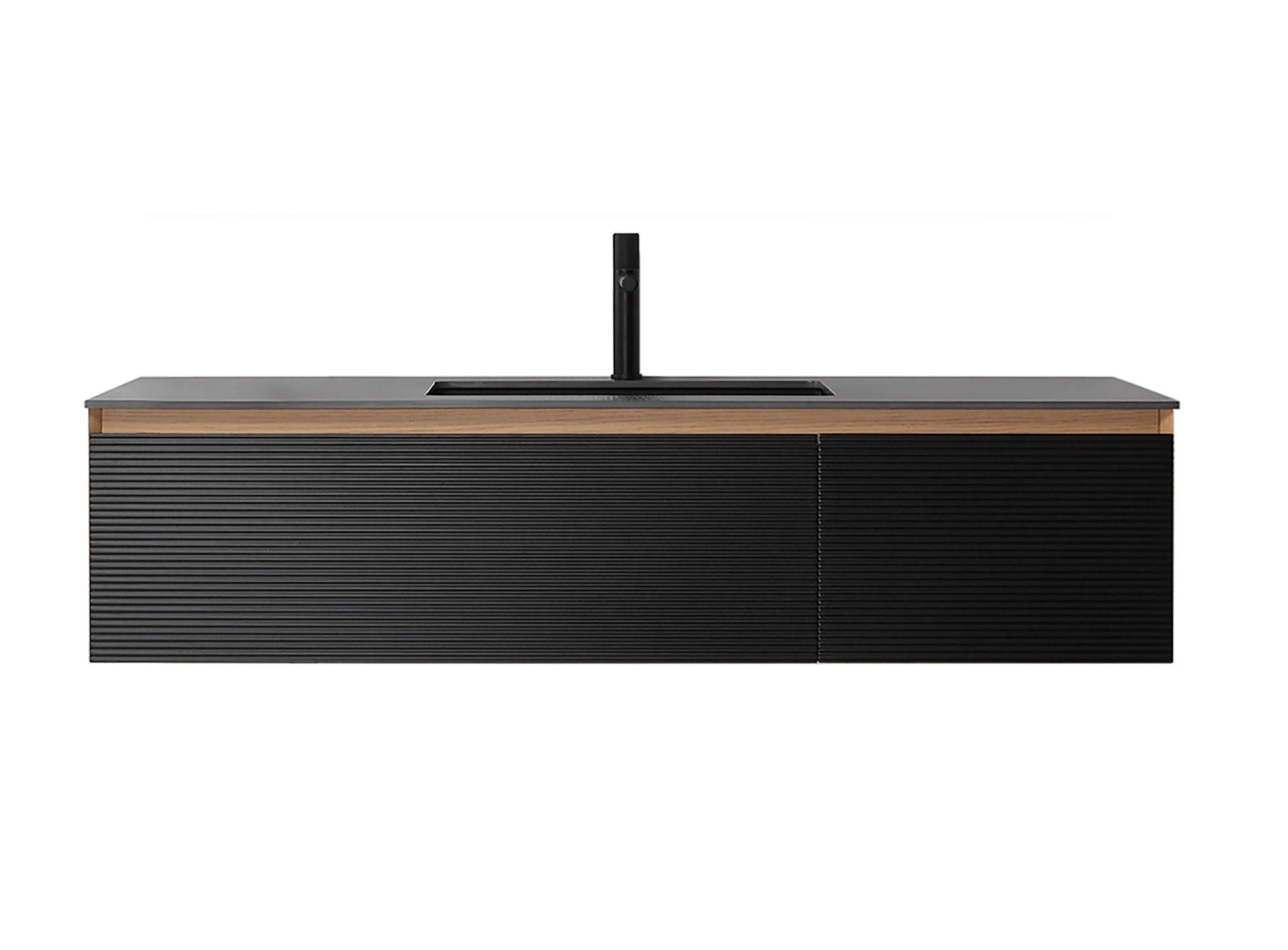 A sleek, wall-mounted vanity in washed oak with textured matte-black front and integrated sink. Designed for modern bathrooms, it delivers clean lines, generous storage with two soft-close drawers, and a striking black countertop.