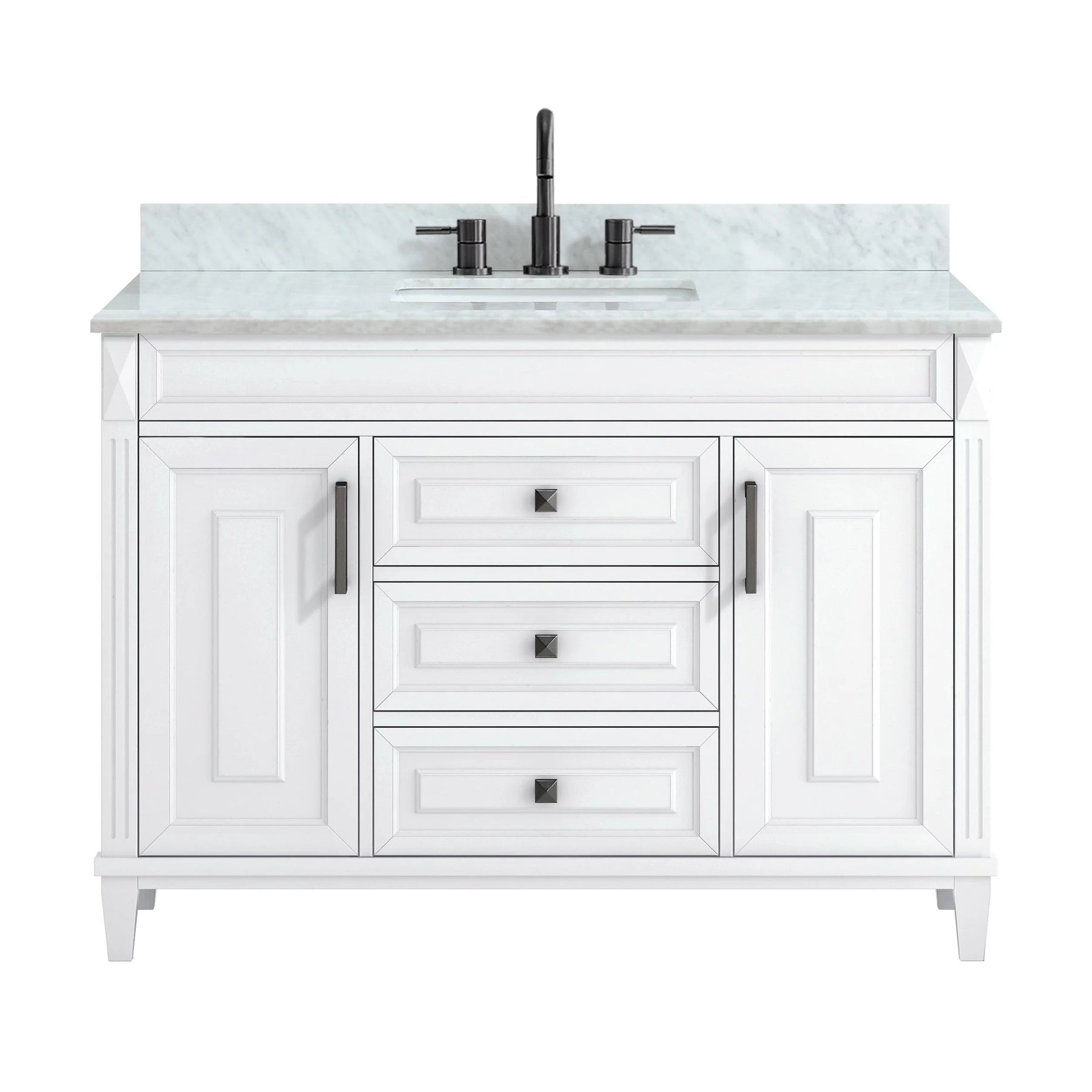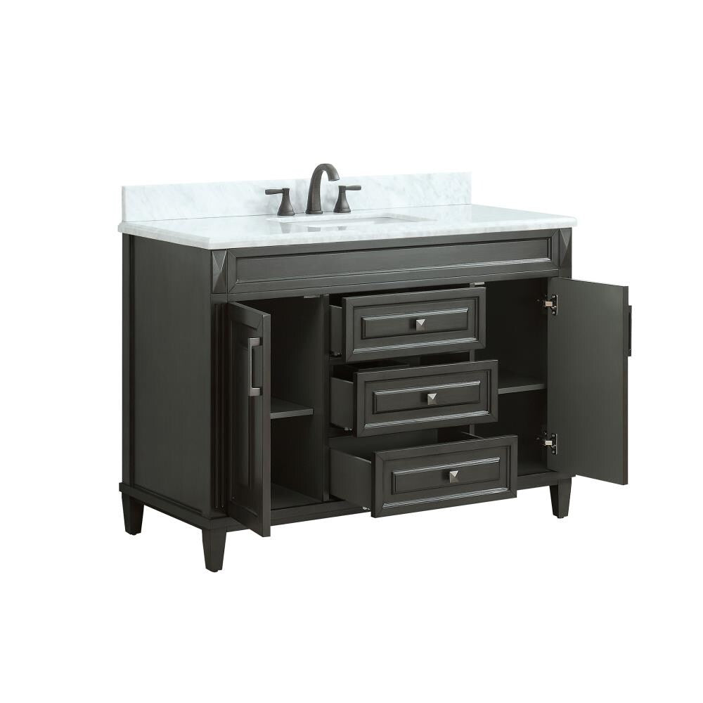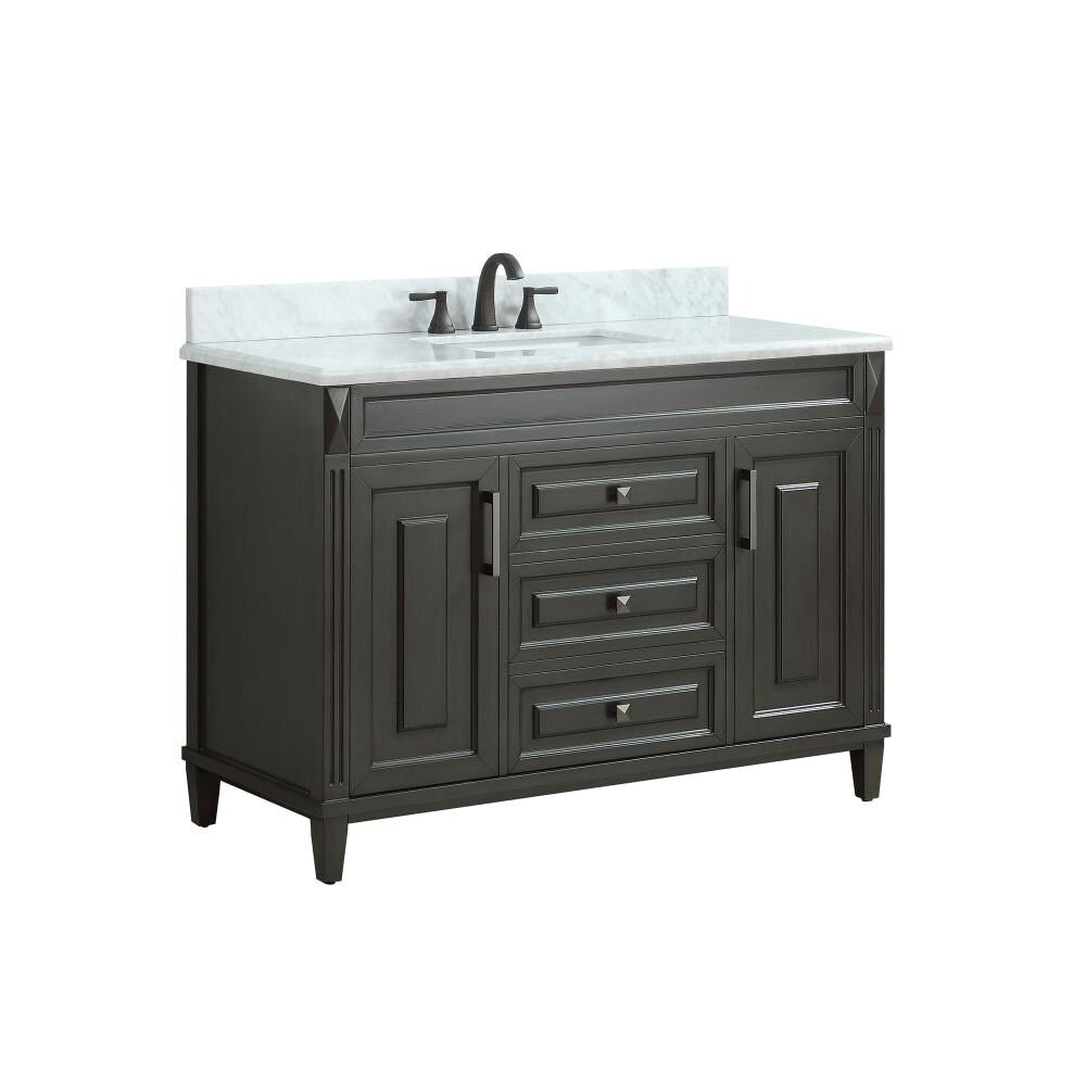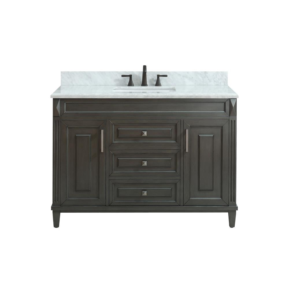 This 49-inch bathroom vanity pairs a classic Sterling cabinet with a white marble top for a refined, transitional look. It features soft-close storage and an undermount rectangular sink, offering both elegance and everyday functionality for bathroom remodels.