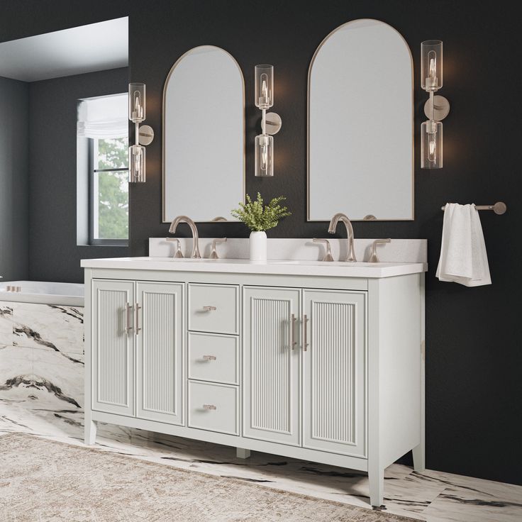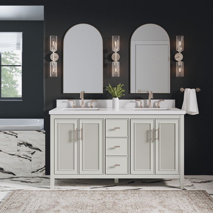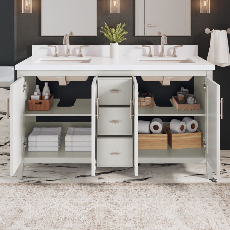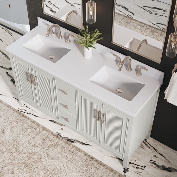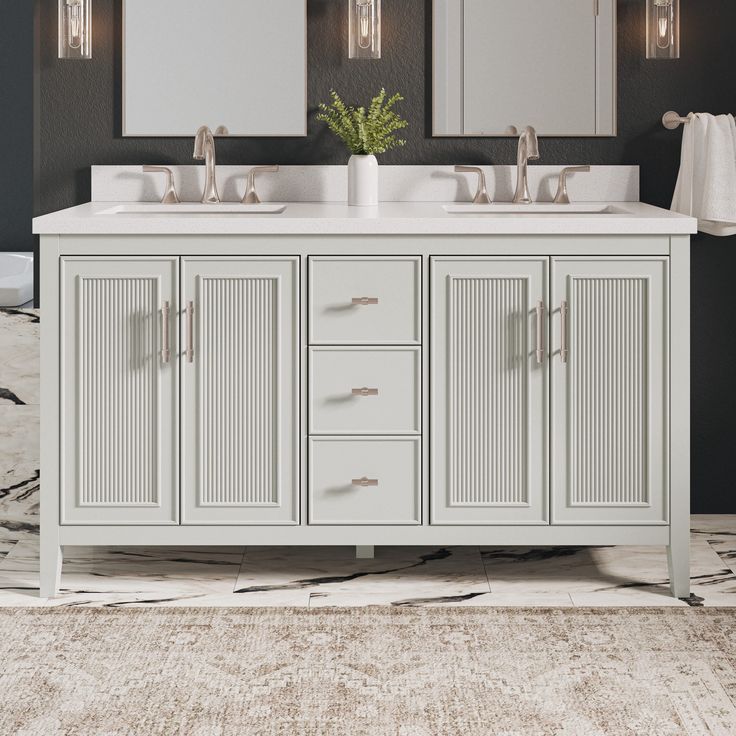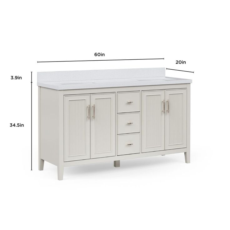 Discover the modern elegance of the Style Selections Alaia 60-in Muse Gray Undermount Double Sink Bathroom Vanity. This luxurious piece features a sleek Muse Gray finish and a spacious White Engineered Stone Top with two undermount sinks. Elevate your bathroom with both style and functionality.