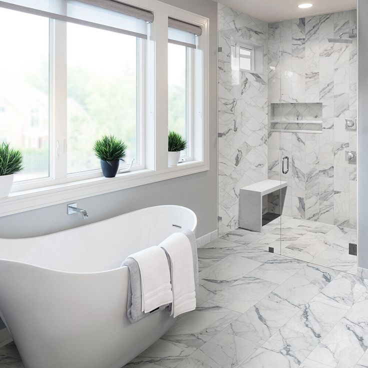A matte white, with grey veining, porcelain floor and wall tile that takes it's cues from the true Statuary natural stone but without any added maintenance natural stone requires