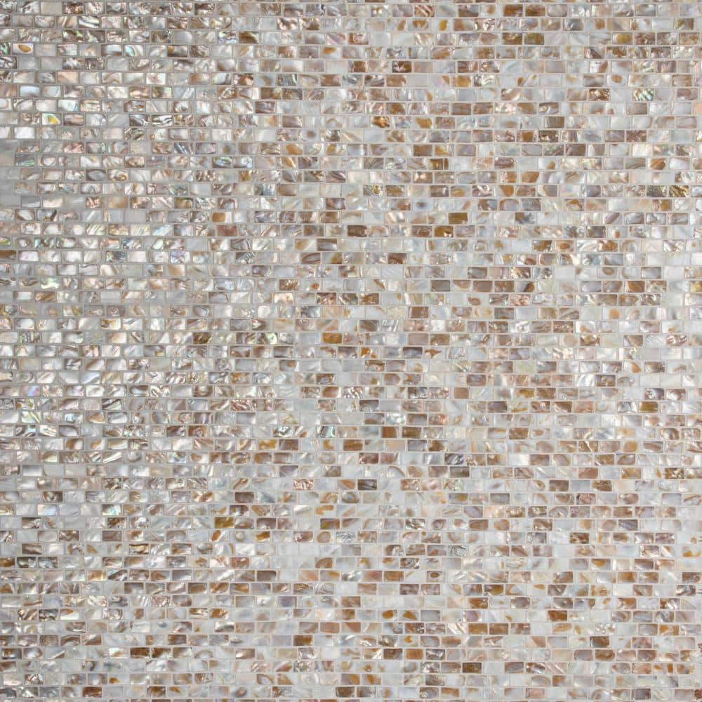 Lustrous natural seashell mosaic in a classic mini-subway layout brings coastal elegance to backsplashes, showers, and feature walls. Mesh-mounted sheets install seamlessly, and the impervious, frost-resistant build with glossy high-sheen finish brightens any space.