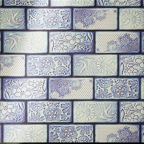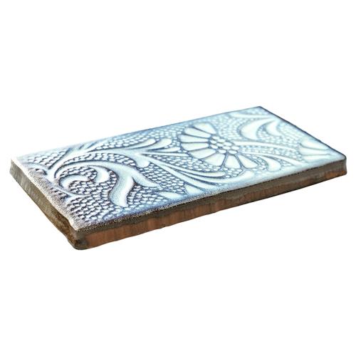 Embossed floral ceramic subway tiles deliver a vintage, handmade look for wall applications. Reactive glaze in light blues with periwinkle-brown edges creates high variation and unique character; ideal for backsplashes and accent walls.