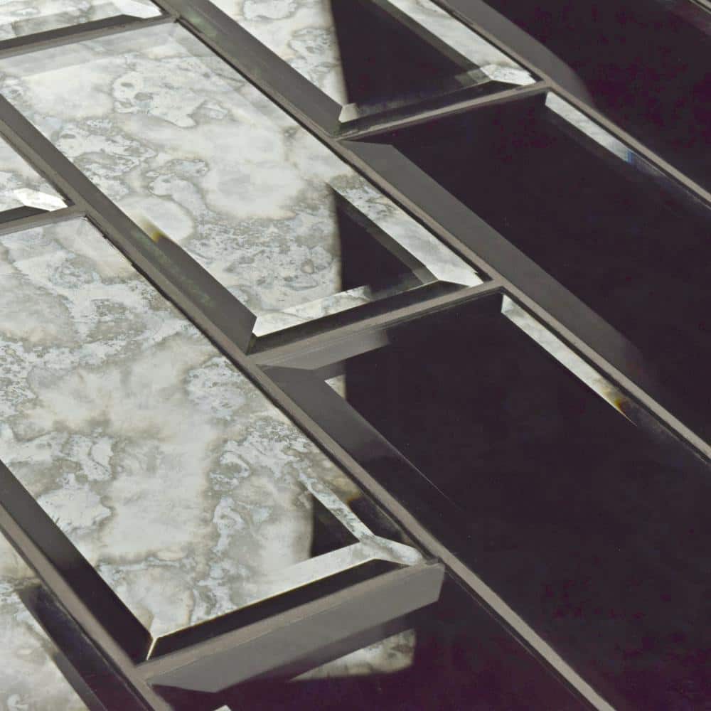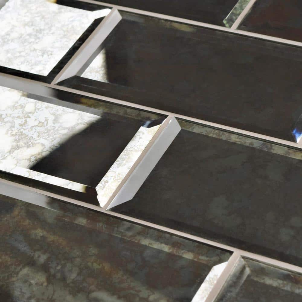 Beveled antique-mirror glass subway tiles that reflect light and add dimensional glamour to backsplashes and feature walls. Impervious, frost-resistant glass construction suits indoor or outdoor wall applications.