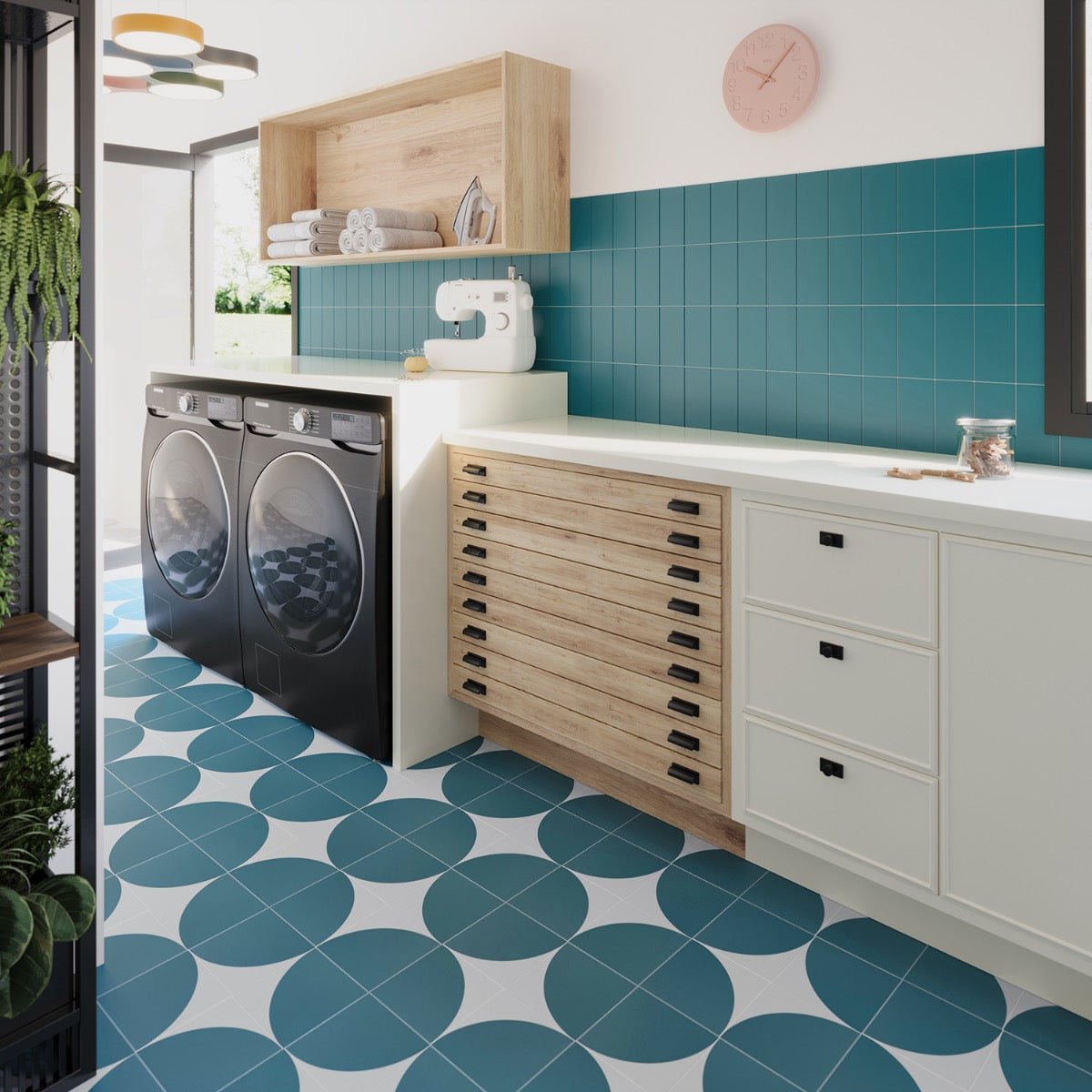 The Maddox Teal Blue Subway Tile by Stacy Garcia offers a vibrant teal color in a timeless subway shape. Made sustainably in Spain, this matte ceramic tile is perfect for creative installations and dynamic designs.