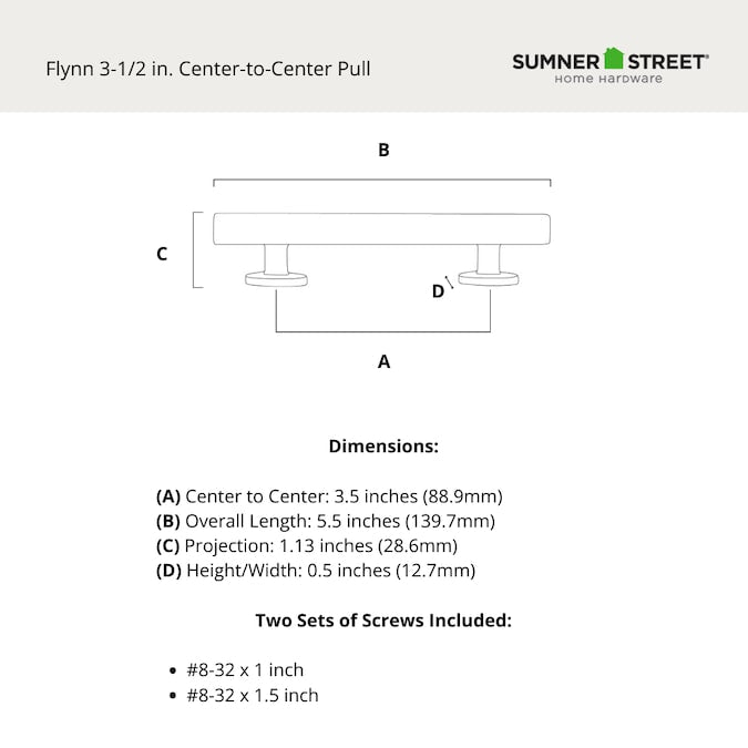 A: The Flynn drawer pull comes with two sets of screws (#8-32 x 1 and #8-32 x 1.5) to fit most cabinetry. Simply align the pull with pre-drilled holes and secure using the included screws.