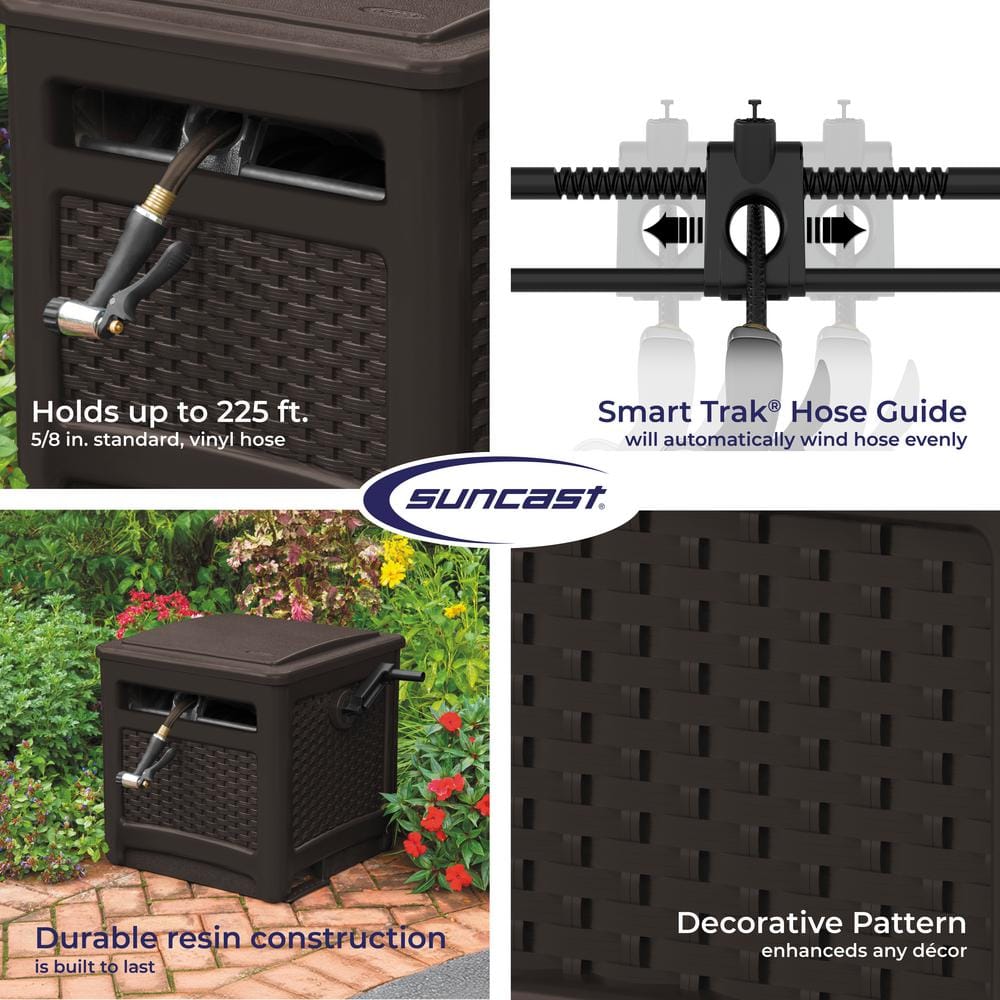 The Suncast Smart Trak Hose Hideaway offers an elegant storage solution for your garden hose, with a 225 ft. capacity and sleek wicker pattern design. Its innovative Smart Trak hose guide ensures smooth, even winding, while the durable resin construction requires no assembly and minimal maintenance, making it a practical choice for any outdoor space.