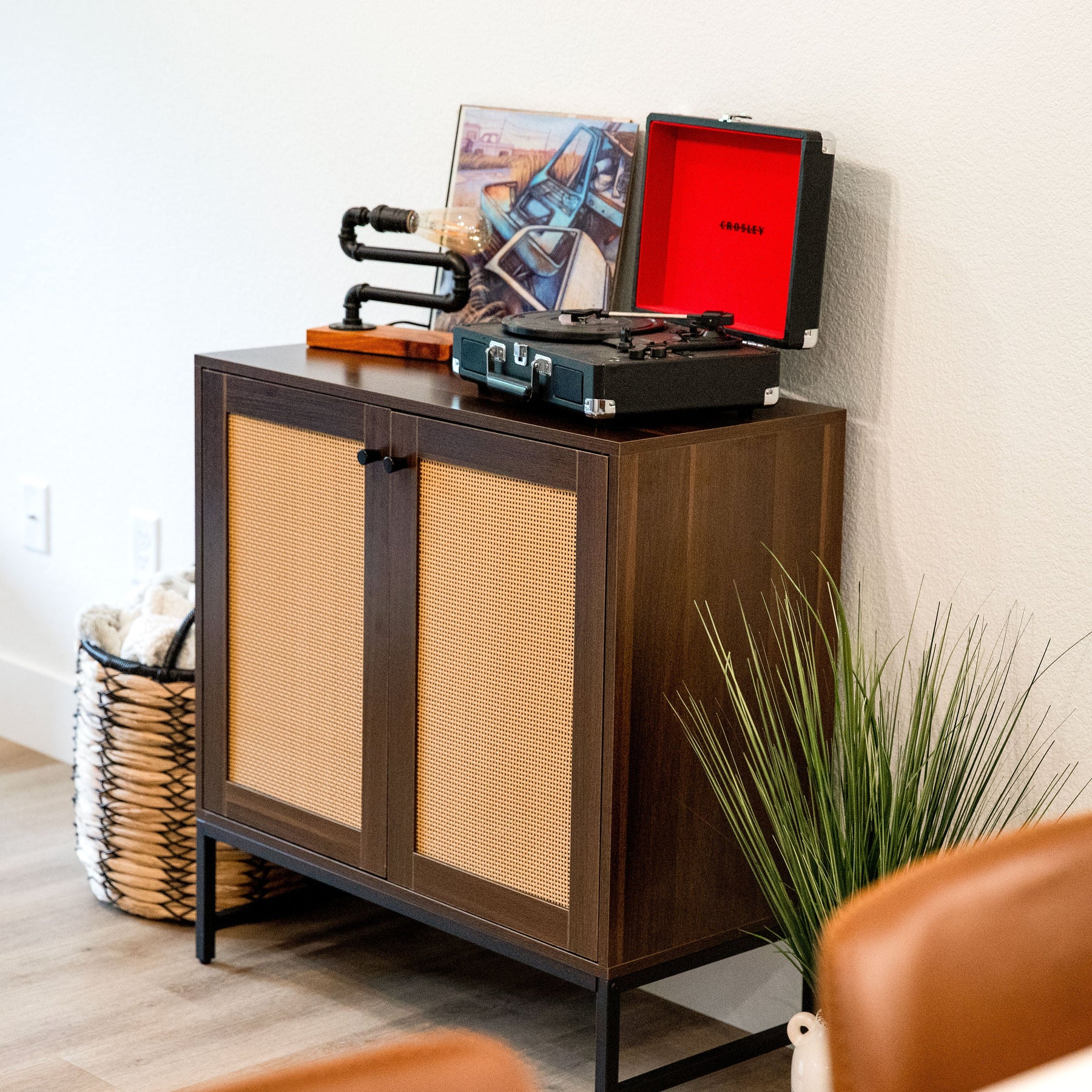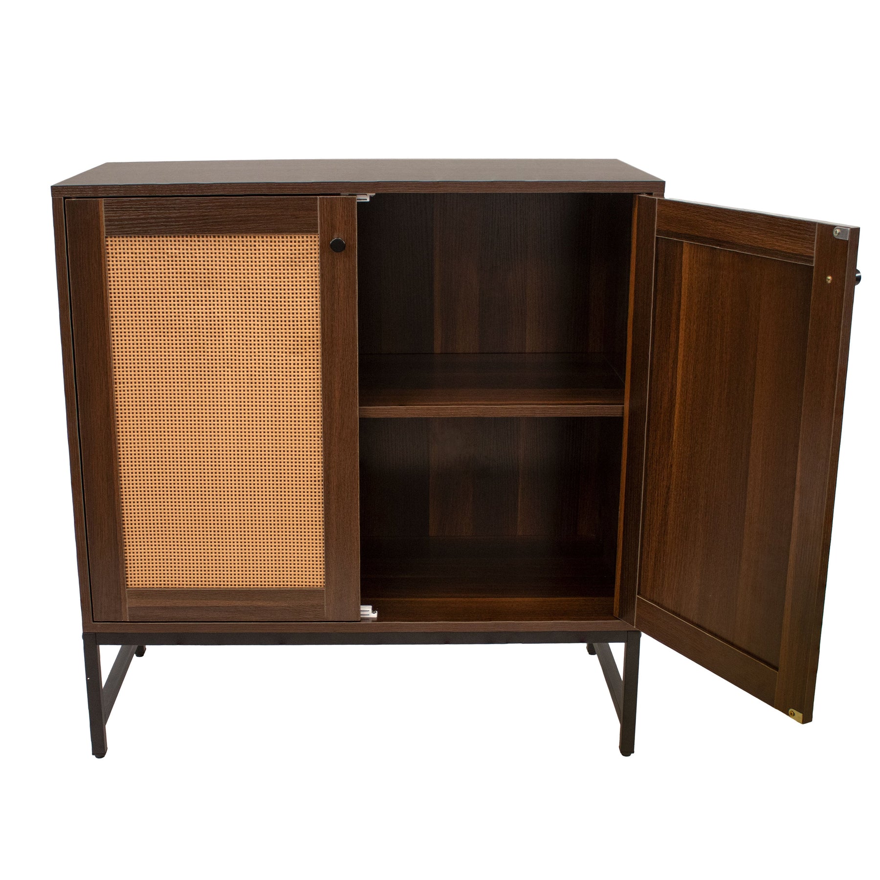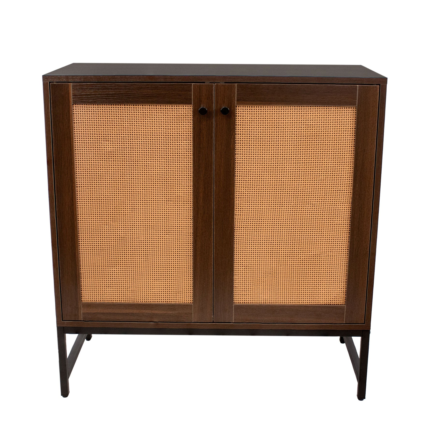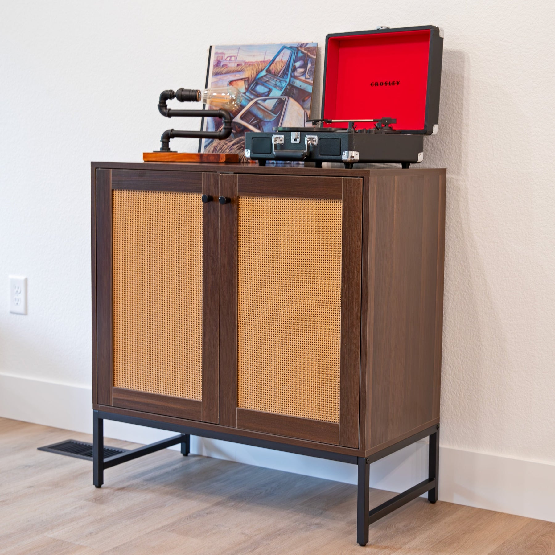 A: The cabinet is made from robust MDF with a real oak wood appearance and features decorative rattan doors, all supported by a sturdy black steel frame.