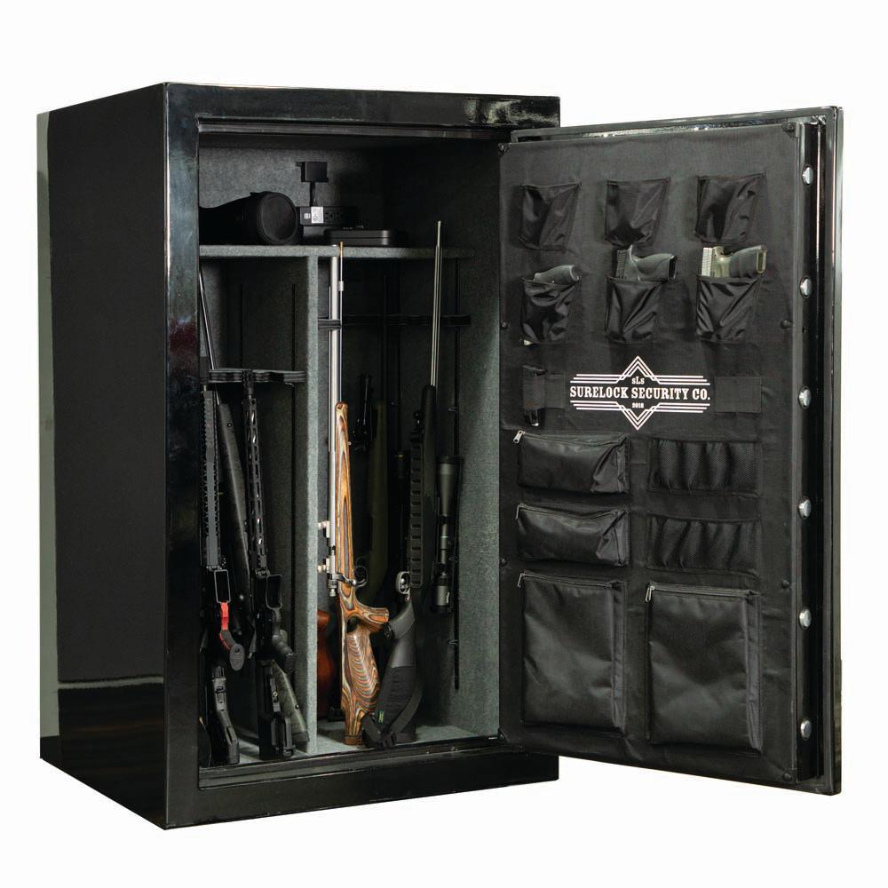 The General Series is as big of a deal as its name. Designed with 11-Gauge steel, (16)1.5 bolts and developed with a 90-minte fire rating (at 1400°F) the General Series is in a class all its own. Big and bad, the General 35 will hold up to 35 guns and boasts an adjustable interior with 2 gun racks and 4 shelves - that can either be adjusted or removed for additional storage. The gloss black exterior with gray interior provides a beautiful contrasting finish while the interior organizational door panel provides even more additional storage space for smaller valuables and documents. Designed for those who value life, liberty and the second amendment, our General 35 Gun and Home Safe was crafted to give you maximum security and protection no matter what life may throw your way. Backed by SURELOCK Security's Lifetime Replacement Program - the General Series Gun and Home Safe offers superior, dependable protection that safely secures all your treasured firearms and belongings.