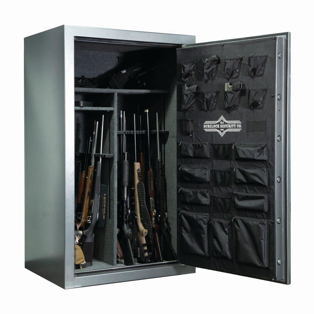 The Colonel 41 was designed for those looking for a little extra storage space with additional fire protection. This Colonel will hold up to 41 guns and is constructed of thick, 11-Gauge steel with a 75-minute fire rating (at 1400°F). With 16, 1.5 thick locking blots, this safe has the security youve been looking for, at a price that wont break the bank. The Colonel 41 proudly offers 2 gun racks and an adjustable interior which consists of 4 shelves, that can either be adjusted or removed for additional storage. Finished in a sharp, charcoal gray and matching light gray interior the Colonel 41 is no doubt, an impressive safe. From looks to construction, SURELOCK has you covered. The Colonel 41 is the perfect gun and home safe for a family, avid outdoorsman or collector who is looking for additional fire protection. Backed by SURELOCK Security's Lifetime Replacement Program - the Colonel Series Gun and Home Safe offers dependable, affordable protection that safely secures all your firearms and valuables.