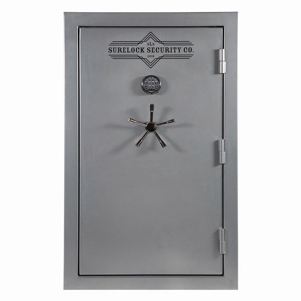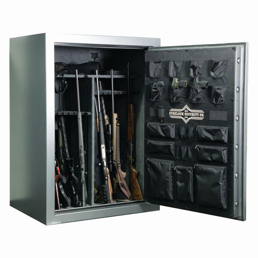 The Colonel 64 is large and in charge, with upgraded fire protection from the Lieutenant Series. It has 2 gun racks and boasts an adjustable interior which has 4 shelves, that can either be adjusted or removed for additional storage. The Colonel 64 will hold up to 64 guns and is constructed of thick 11-Gauge steel, with a 75-minute fire rating (at 1400°F). All these features help to give you piece of mind should a fire or attempted burglary every occur. The Colonel Series also has 16, 1.5 locking bolts, to provide even more security and protection. Finished in a sharp, charcoal gray and matching light gray interior, the exterior is easy on the eyes, while the interior allows for complete customization. The perfect gun and home safe for the avid collector, sportsman or (large) family man that is looking for a little extra fire protection for their valuables and firearms. Backed by SURELOCK Security's Lifetime Replacement Program - the Colonel Series Gun and Home Safe provides superior, dependable protection so you can safely secure all your valuables and belongings.