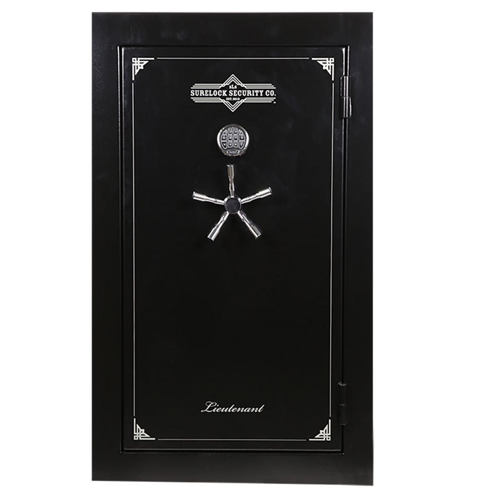 The Gen II Lieutenant 25 is the smallest safe in the Lieutenant Series, but still offers plenty of storage space for your firearms and valuables. It will hold up to 25 long guns, with additional storage space for handguns in the door organizer and is constructed of 12-Gauge steel with a 60-minute fire rating (at 1400°F) - providing excellent protection in the event of a fire. The Lieutenant 25 has 10, 1.5 in. locking bolts (6 active), as well as 3 adjustable shelves and 2 gun racks, that can be removed for additional space if desired. All Lieutenants come with an interior organizational door panel, allowing for easy access and convenient storage of smaller personal items like keys or passports. The matte black exterior with matching gray interior and chrome handle and lock create a look that is crisp and clean. Yes, we know a safe is a big metal box, but that doesn't mean it has to look obtrusive. The Lieutenant 25 is the perfect gun and home safe for the beginning collector or growing family looking for additional fire protection. Backed by SureLock Security's Lifetime Replacement Program - the Lieutenant Series Gun and Home Safe offers superior, dependable protection that safely secures all your treasured possessions and firearms.