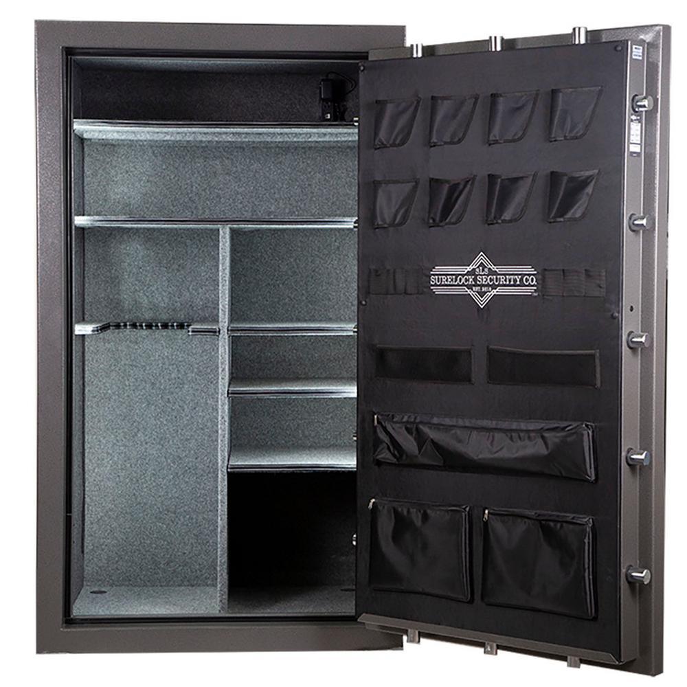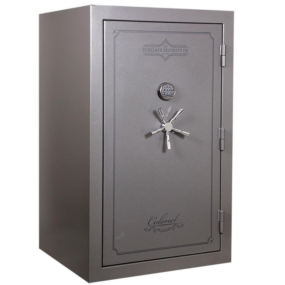 The Gen II Colonel 35 (tall) was designed for those looking for a little extra storage space with additional fire protection. This Colonel will hold from 34-36 long guns and is constructed of thick, 11-Gauge steel with a 75-minute fire rating (at 1400°F). With 16, 1.5 in. thick locking bolts, this safe has the security you've been looking for, at an affordable price. Don't sacrifice quality for cost when defending what matters most to you - matters. With SureLock, you'll never have to. The Colonel 34 proudly offers 2 gun racks, an upgraded interior organizational door panel with padded pistol pockets and an adjustable interior - which consists of 3-shelves, that can either be adjusted or removed for additional storage. Speaking of additional storage, including the pistol pockets this safe will hold over its 34-gun count, as you can store smaller firearms in the door panel. Finished in a sharp, charcoal gray and matching light gray interior with black accents, the Colonel 34 is no doubt, an impressive safe. From looks to construction, SureLock has you covered with the Gen II Colonel 34. This is the perfect gun and home safe for a family, avid outdoorsman or collector who is looking for additional fire protection (or a major theft deterrent). Backed by SureLock Security's Lifetime Replacement Program - the Colonel Series Gun and Home Safe offers dependable, affordable protection that safely secures all your firearms and valuables.