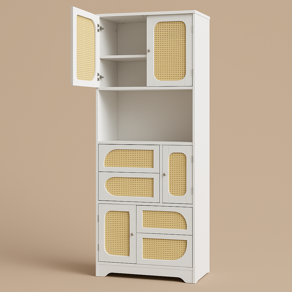 Tatayosi White Storage Cabinet with Rattan Doors, 71" Pantry Hutch Cabinet