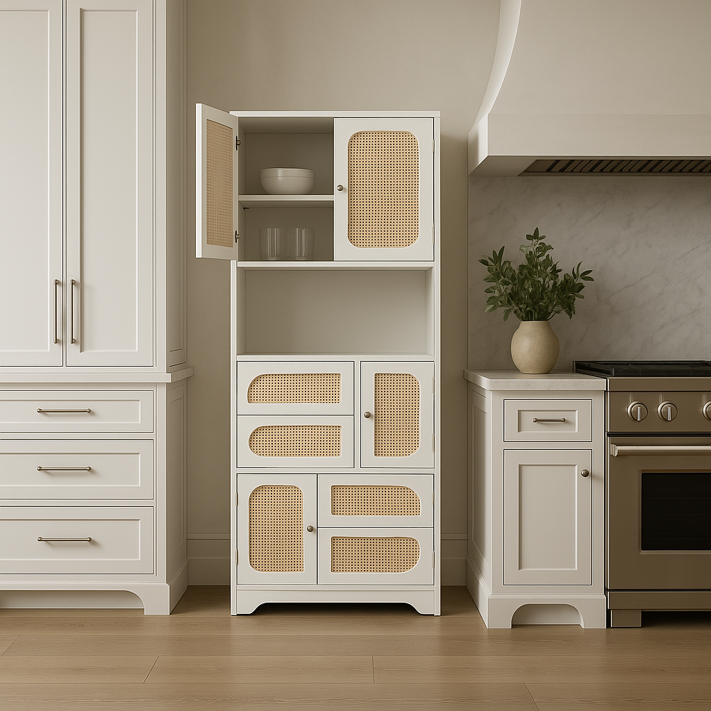 White Storage Cabinet with Rattan Doors