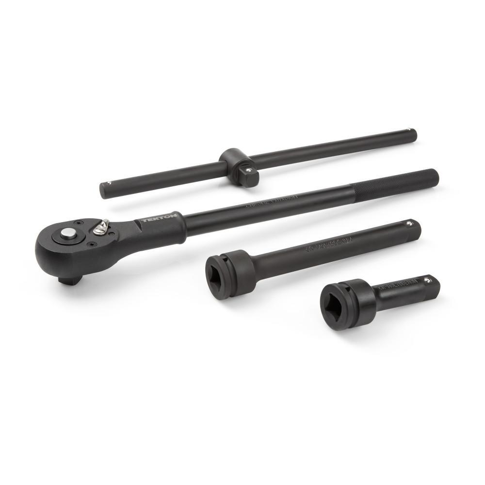 From trucks and tractors to heavy equipment and large machinery, big service and repair jobs need the TEKTON 3/4 in. Drive Impact Socket Set (22-Piece), with a range of sizes from 7/8 to 2 in. Whether you drive them with an impact wrench or by hand, these premium chrome molybdenum sockets deliver superior performance. To prevent stripping or round-off under high stress, they feature a 6-point, high-torque design that contacts and grips the stronger flat sides of nut or bolt head, not the weaker corners. Extra large, high-contrast size markings are permanently laser etched onto each socket, making size selection quick and easy, even in low light. The 18 in. 24-tooth quick-release ratchet, with non-slip knurled handle, locks onto sockets so they will not stick to fastener or fall off. To loosen frozen fasteners, grab the 18 in. breaker bar. Its sliding T head can be positioned at any point for maximum two-handed leverage. All parts are protected by a durable, corrosion-resistant black phosphate finish, and store in a heavy duty carry case.