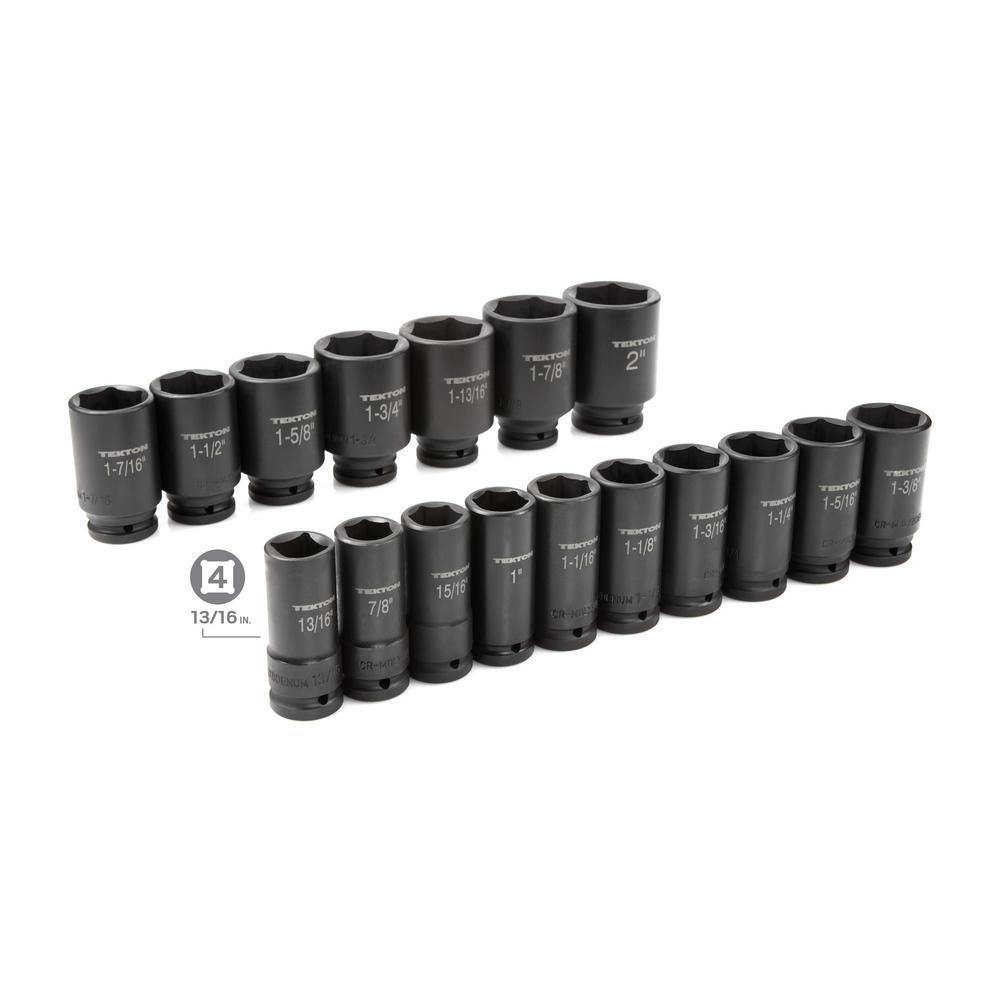 • Set includes: 16-piece 3/4 in. drive impact sockets: 7/8, 15/16, 1, 1-1/16, 1-1/8, 1-3/16, 1-1/4, 1-5/16, 1-3/8, 1-7/16, 1-1/2, 1-5/8, 1-3/4, 1-13/16, 1-7/8, 2 in.