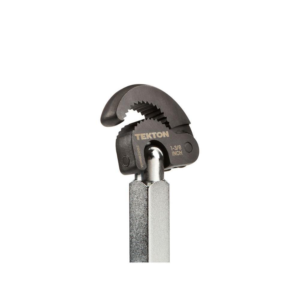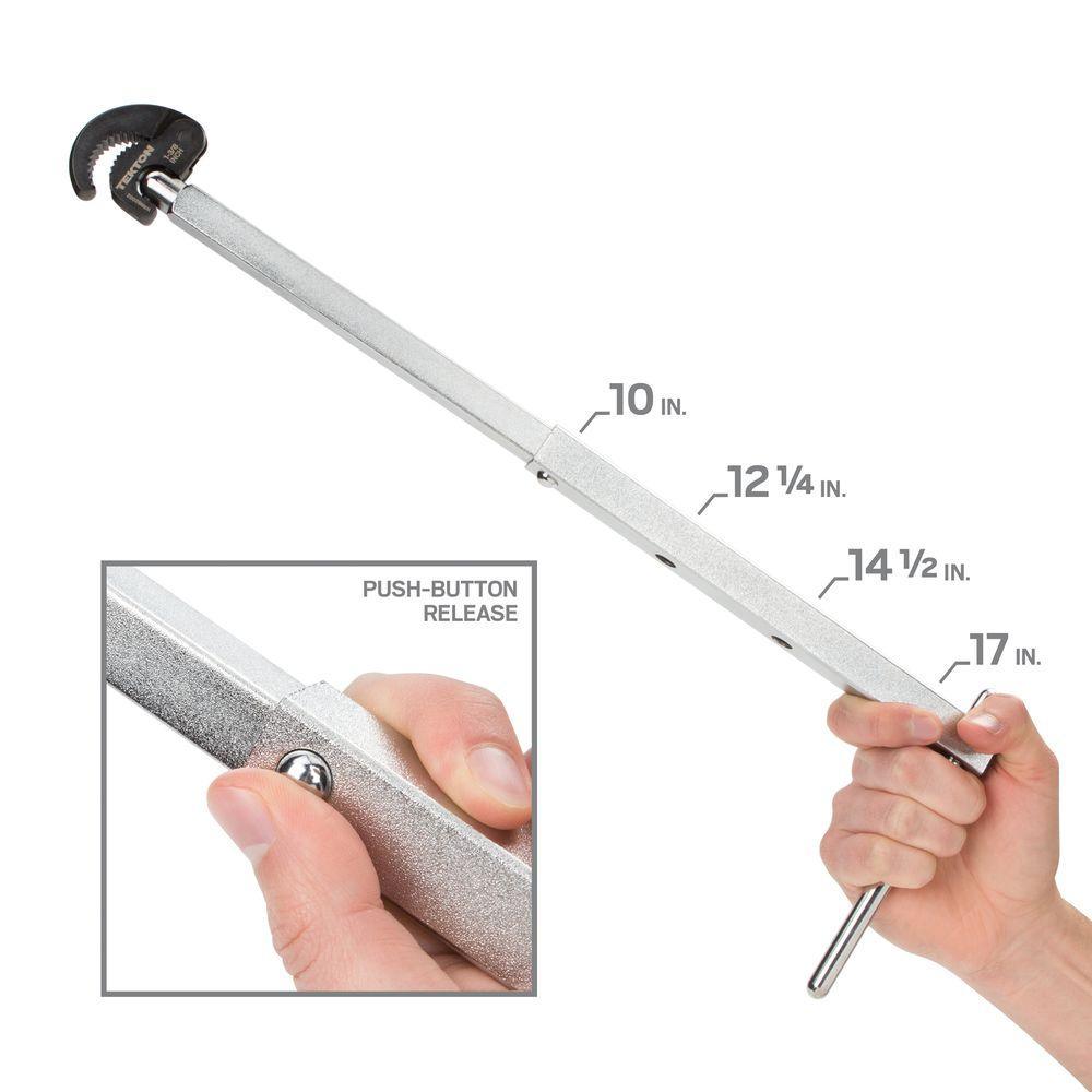Uniquely designed for easy, one-handed operation in confined areas, the TEKTON Telescoping Basin Wrench takes the frustration out of under-sink work. The spring-loaded jaw automatically adjusts to the right size as it slides onto the nut, so there's no trial-and-error hassle. Once in place, it creates a continuous ratcheting action that stays engaged with the nut, eliminating the need to re-fit after each turn. Pivoting smoothly through 180°, the wrench head has a friction stop that holds it at any angle, allowing you to navigate around obstructions and access hard-to-reach nuts. The four-position telescoping shaft adapts to any situation with the push of a button, locking in place at 10, 12-1/4, 14-1/2, and 17in. lengths. This extra reach is especially helpful under deep bowl sinks. With a removable 6in., high-leverage handle, the wrench easily stores in a toolbox or drawer.