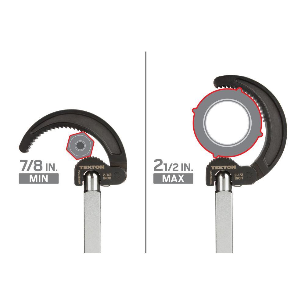 Uniquely designed for easy, one-handed operation in confined areas, the TEKTON Telescoping Basin Wrench takes the frustration out of under-sink work. Ideal for larger nuts and retaining collars on faucets, supply lines, valves, pipes and drain cups, this wrench is specially designed with an extra-long upper jaw that accommodates sizes from 7/8 in. to 2-1/2 in. outer diameter. As it slides onto the nut, the spring-loaded jaw automatically adjusts to the right size, so there is no trial-and-error hassle. Once in place, it creates a continuous ratcheting action that stays engaged with the nut, eliminating the need to refit after each turn. Pivoting smoothly through 180°, the wrench head has a friction stop that holds it at any angle, allowing you to navigate around obstructions and access hard-to-reach nuts. The four-position telescoping shaft adapts to any situation with the push of a button, locking in place at 10 in. 12-1/4 in. 14-1/2 in. and 17 in. lengths. This extra reach is especially helpful under deep bowl sinks. With a removable 6 in. high-leverage handle, the wrench easily stores in a toolbox or drawer.