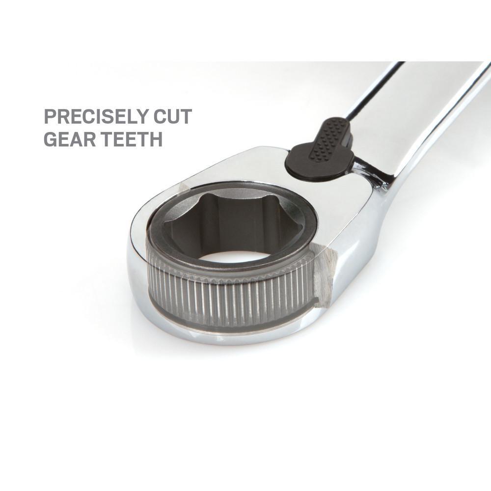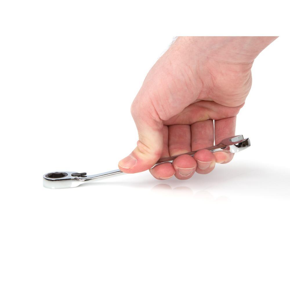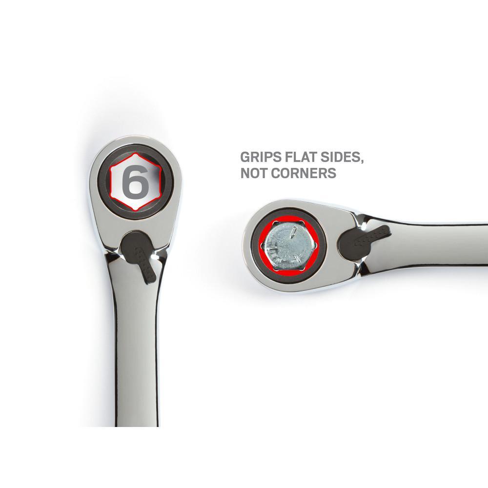 Offset 6-Point Box End: Providing a sure, snug fit on hex-shaped fasteners, a 6-point box end resists slipping off while you work, saving aggravation and your knuckles. To prevent damaging round-off, the interior geometry contacts and applies force to the flat sides of fastener heads rather than the corners. The box end is offset to 15°, providing clearance for fingers to work around obstructions. Reversible Drive: Instantly toggle the drive direction with a flip of the thumb switch, even while the wrench is still engaged with fastener head. Low profile and with a biasing action, the switch resists sticking or being accidentally bumped out of position while operating wrench. 5° Swing Arc: A ratchet gear with 72 teeth requires just 5° of swing arc to reach the next tooth position, so it's fast and efficient when there's not much room to move. The teeth of the ratchet gear are cut, not press formed, creating a crisp, precise profile that fully engages with the pawls and can't skip or slip under high stress. Angled Open End: The open end is angled 15° so the wrench can be flipped over with each rotation to engage the fastener twice as often in tight spaces. Organized Storage: The Store-and-Go Keeper has a folding handle that saves space in your drawer or tool chest. When you're on the move, the nonslip grippers lock wrenches securely in place.