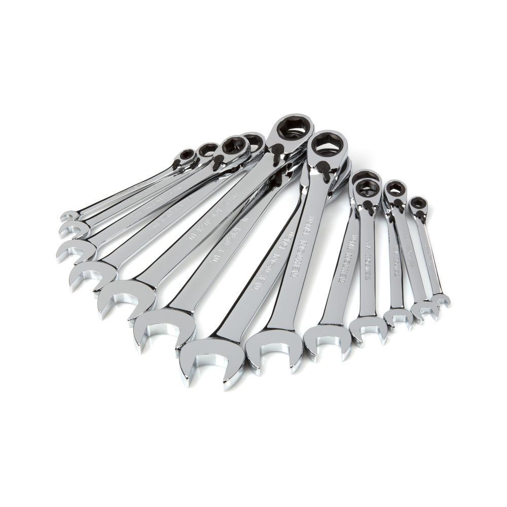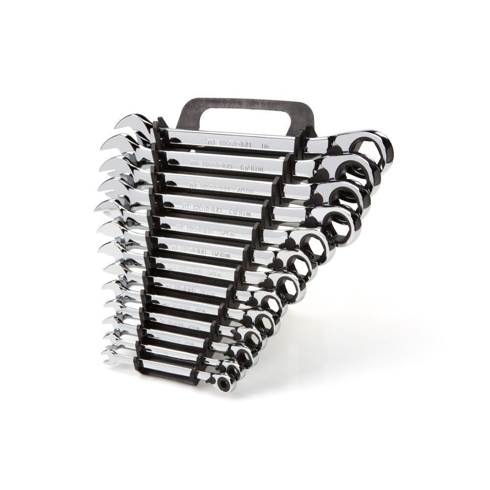 • 13-piece reversible ratcheting combination wrenches: 1/4 in., 5/16 in., 3/8 in., 7/16 in., 1/2 in., 9/16 in., 5/8 in., 11/16 in., 3/4 in., 13/16 in., 7/8 in., 15/16 in., 1 in.