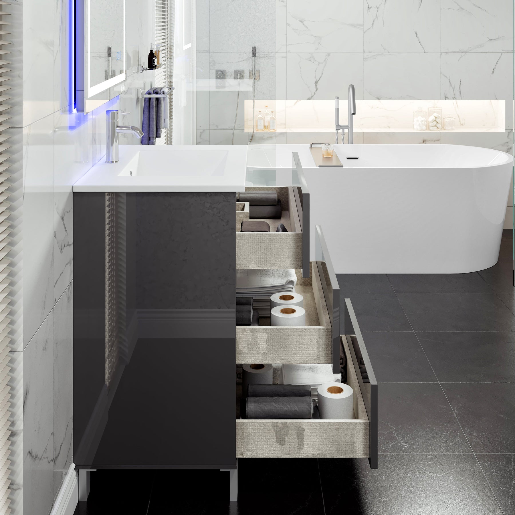 This vanity brings a crisp architectural silhouette to the bath, its glossy gray planes punctuated by luminous chrome pulls. The porcelain integrated sink feels tailored and pristine, a clean ribbon of white against the moody lacquer. Style it with minimal hardware and layered towels to let the reflective surfaces play with light. It’s a polished essential that anchors a luxurious, modern retreat.