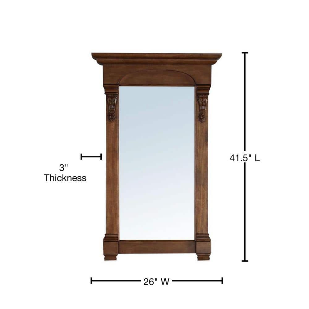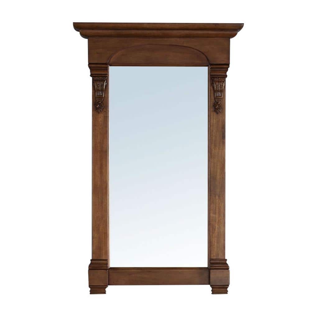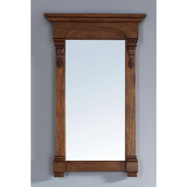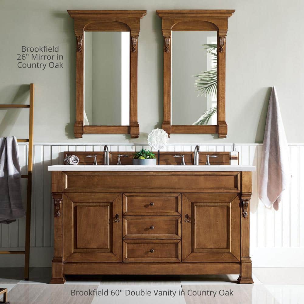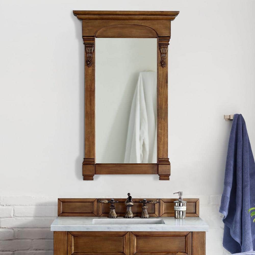 The Brookfield Vanity Mirror by James Martin Vanities combines modern and traditional styles with hand-carved accents and a warm Country Oak finish. Its solid hardwood frame and premium undercoat ensure durability and elegance.
