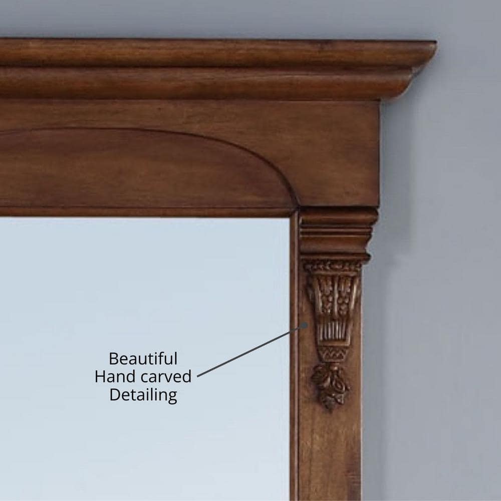The Brookfield Vanity Mirror by James Martin Vanities combines modern and traditional styles with its hand-carved filigrees and warm cherry finish. Crafted from solid kiln-dried hardwood, it offers durability and elegance for any bathroom.