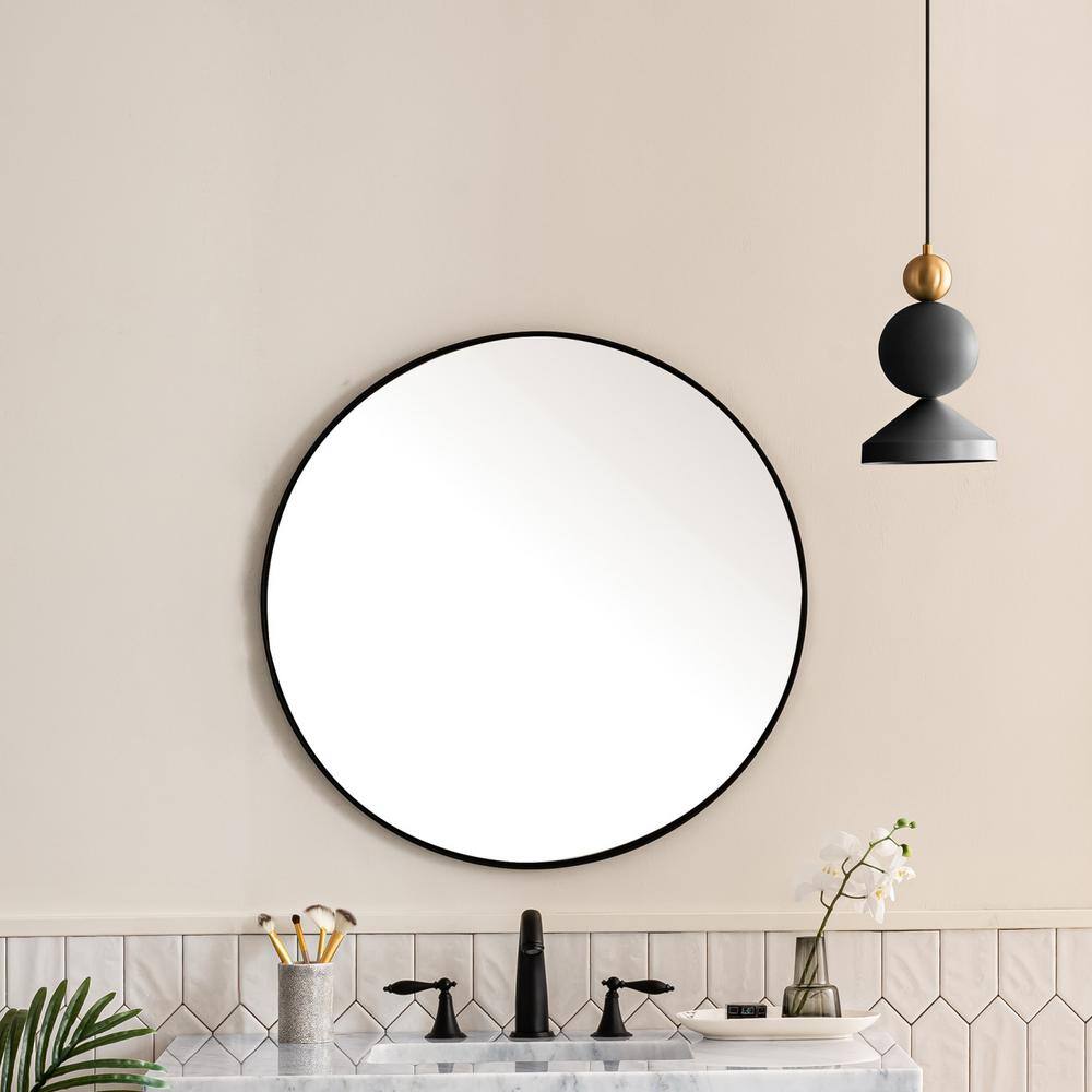 The James Martin Vanities Rohe Bathroom Vanity Mirror features a sleek, round design with a matte black finish. Its stainless steel frame and bevel-cut glass add a modern touch to any bathroom.