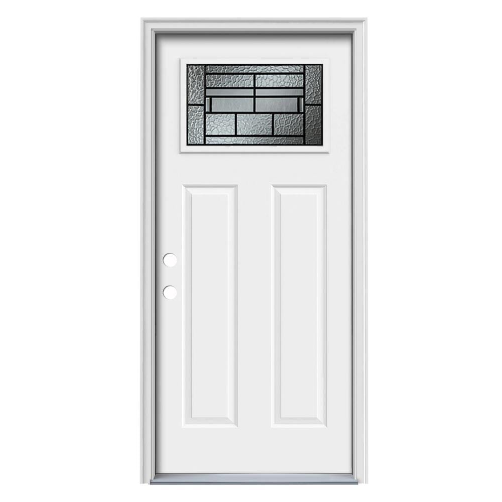 Durable steel prehung entry door featuring Pembrook decorative Craftsman glass and an insulating core for energy-saving performance. Delivered unfinished and ready to paint, it includes frame, weatherstrip, sill, hinges, and brickmould for a precise, low-maintenance fit.