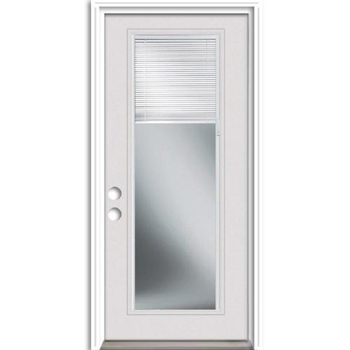 Durable steel prehung entry door featuring a full-lite Low-E glass panel with built-in blinds for privacy and light control. Ready-to-paint unfinished surface arrives as a complete door system with brickmould, weatherstripping, and adjustable sill for a precise, long-lasting fit.