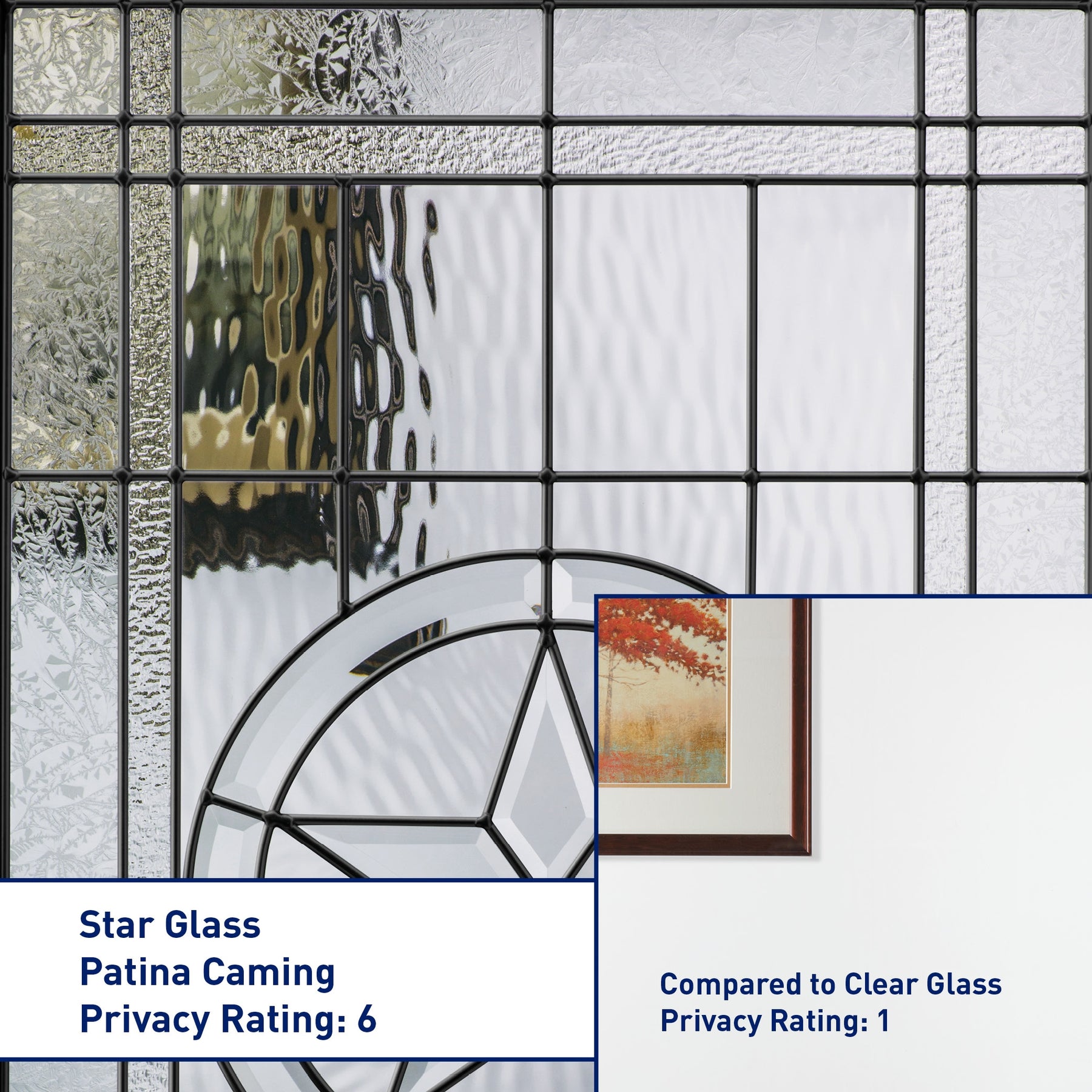 • Decorative Star Glass: Patina caming, privacy rating 6, triple-pane insulated