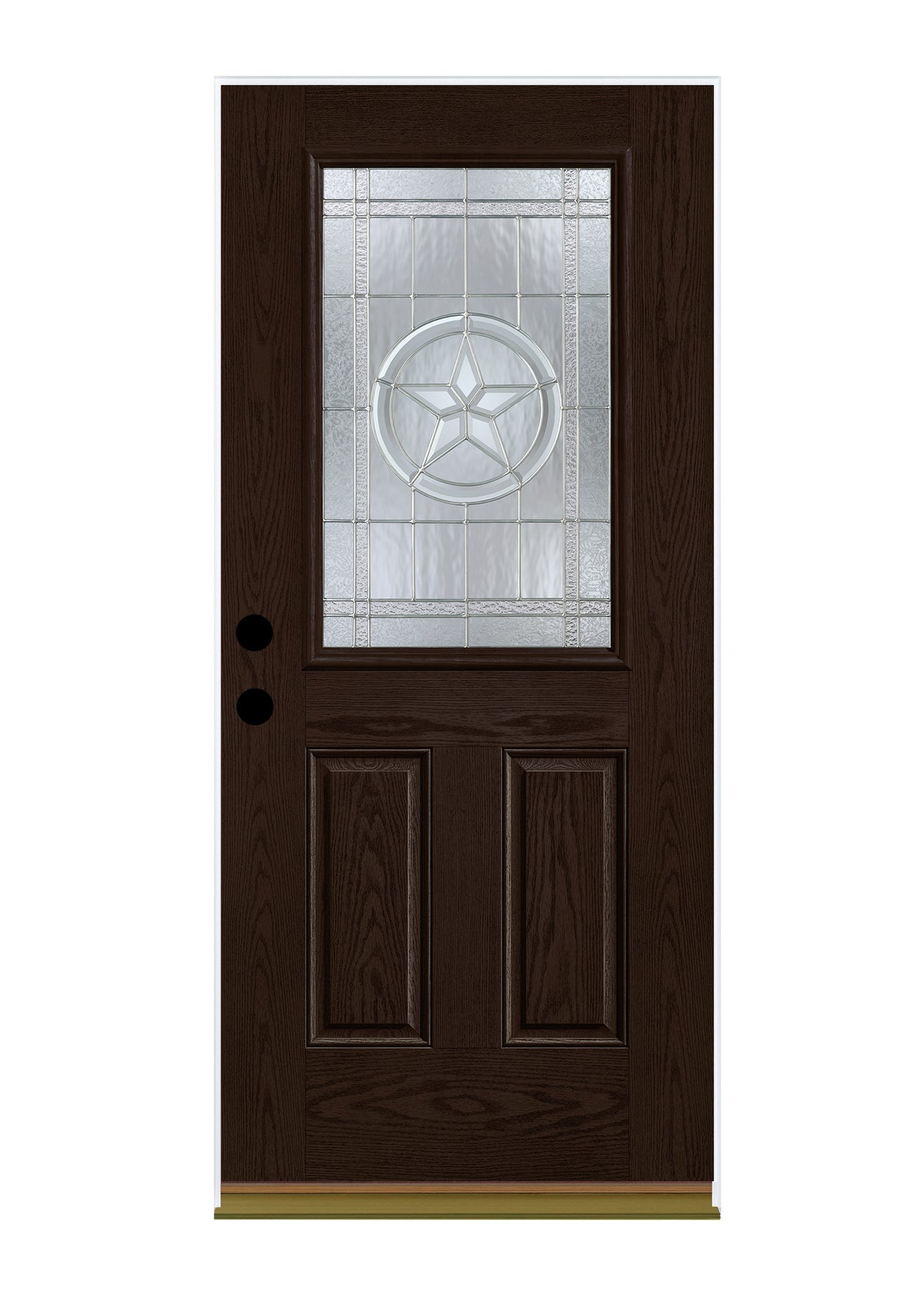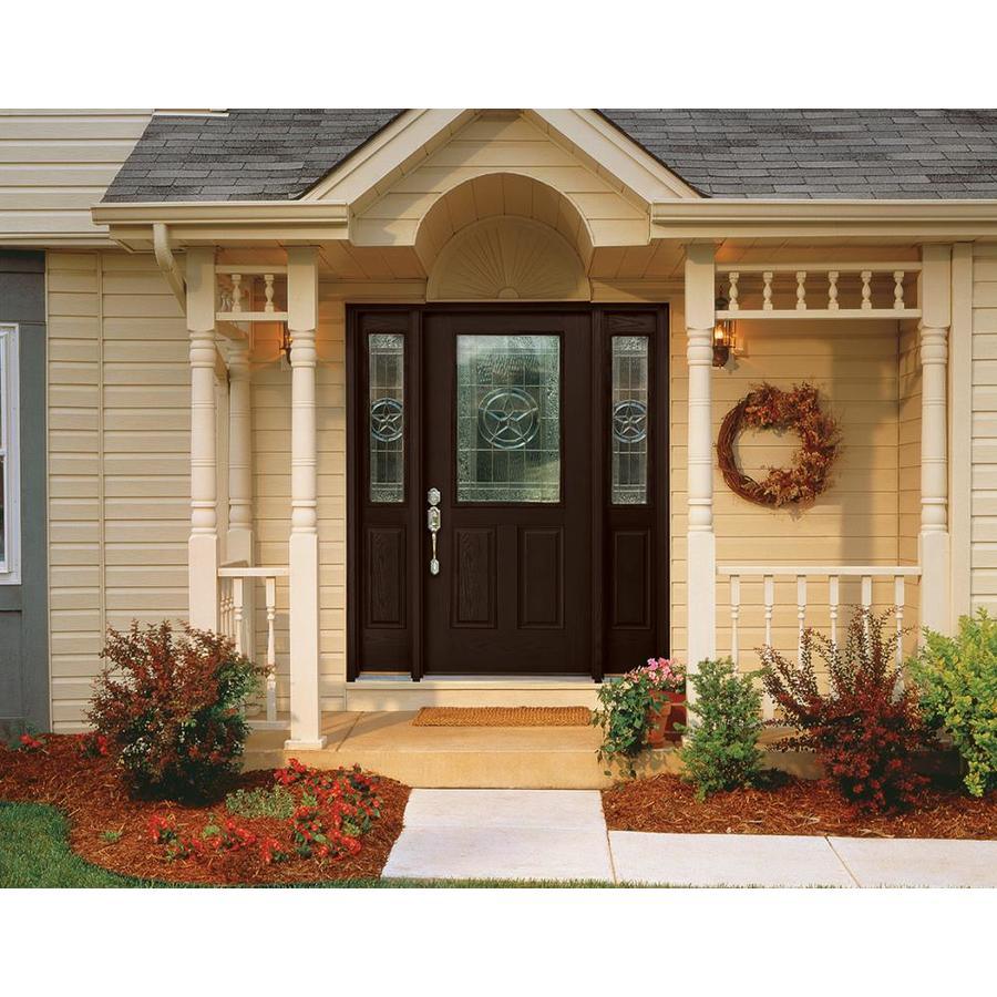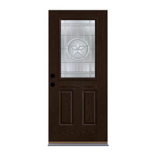 Durable fiberglass entry door with Star decorative glass brings rustic character and energy-efficient performance. Prehung for easy installation, featuring Dark Elm stain on Fiber-Classic Mahogany and an insulating core for comfort year-round.