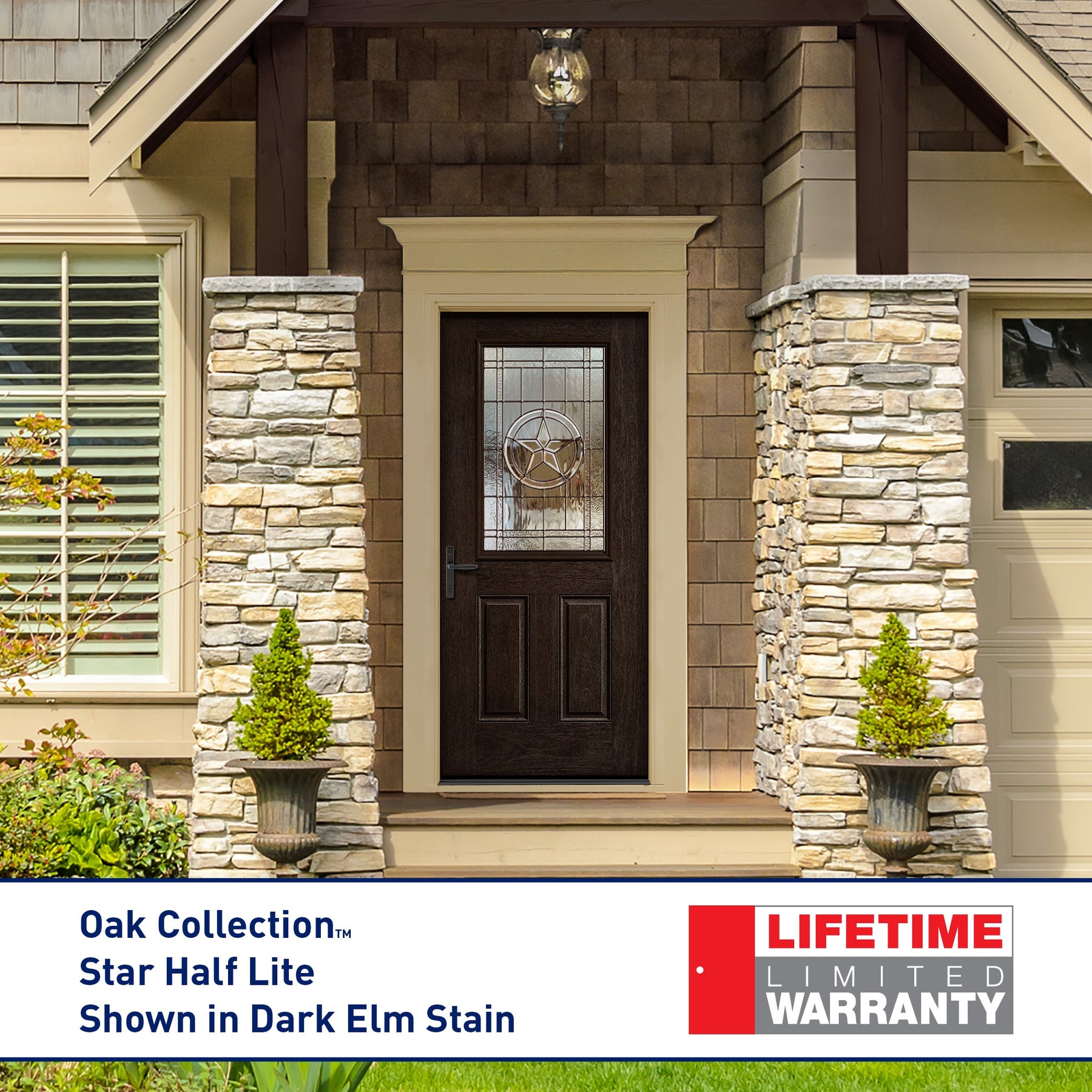 The Dark Elm finish lends a rich, heirloom warmth that anchors the entry with confident sophistication. A striking star medallion in the half‑lite creates a focal point that feels both welcoming and iconic. Pair it with oil‑rubbed bronze hardware and layered natural textures—think stone planters and cedar accents—for a curated, craftsman vibe. This door is a refined statement piece that elevates the threshold to luxurious living.