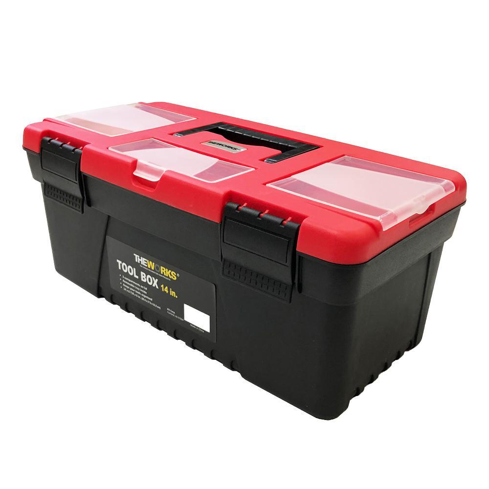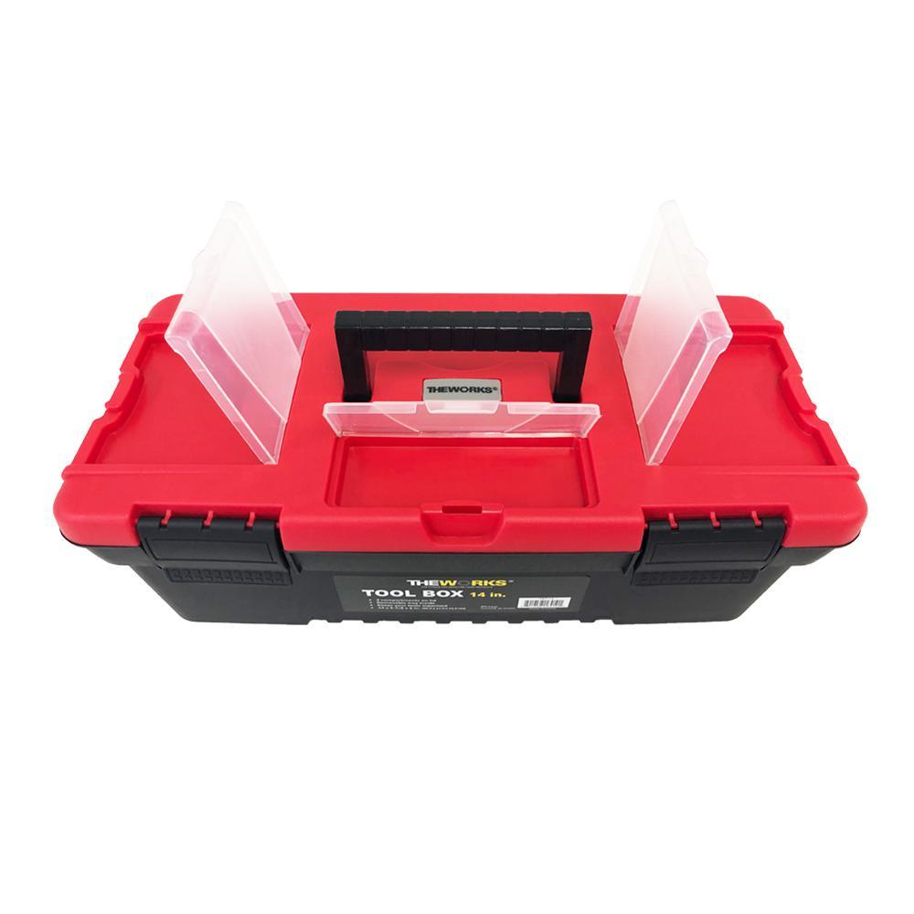 THEWORKS® 14 in. Tool Box stores and organizes your tools and parts, and can be conveniently carried along anywhere with you. It is ideal for all you do-it-yourselfers and crafters! The top of the tool box features three small compartments with see through lids, providing quick access to your smaller parts and hardware like pins, nails, screws and driver bits. When you release the latches, you will find a removable tray inside for additional storage and organization. The entire space can be so easily utilized that you can store all the handy tools you need for your home improvement projects, crafts and other hobbies. You will never misplace your tools and have trouble finding them again!