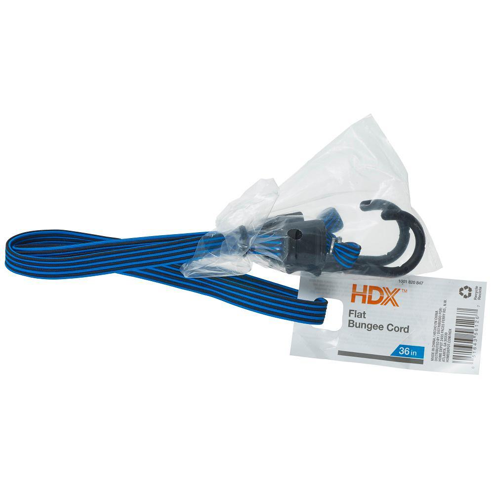 HDX 36 Flat Bungee Cord is fabricated from top quality rubber delivering convenience and reliability for all your cargo transport needs. The flat cord is designed to distribute load weight for efficiency and will not dig in to cargo. It features oversized coated steel hooks to protect from rust or marring and UV resistant woven outer-jackets to withstand the elements and repeated use.