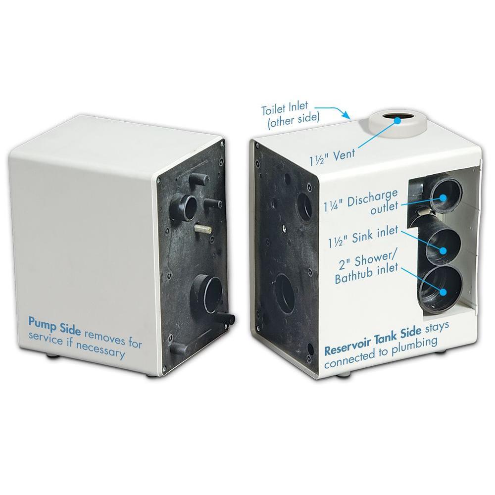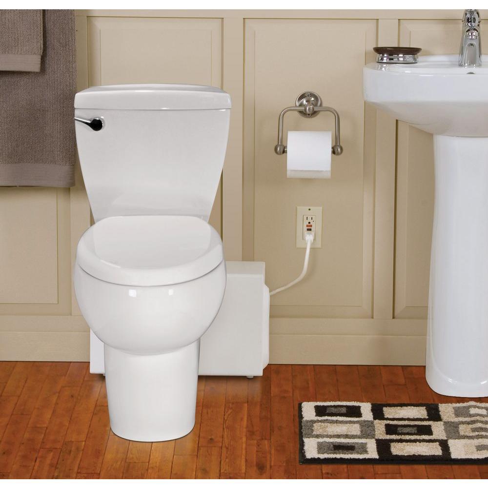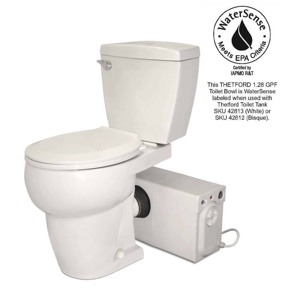 The Bathroom Anywhere is the best choice in wastewater transfer products and macerating toilet systems. Whether you're looking for a basement toilet flush up, something for a loft or even the garage, our macerating system is the ideal solution. The Bathroom Anywhere Complete System includes macerating pump, toilet bowl with lid, and toilet tank. Bathroom Anywhere by THETFORD is now 1.28 Gal.