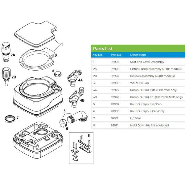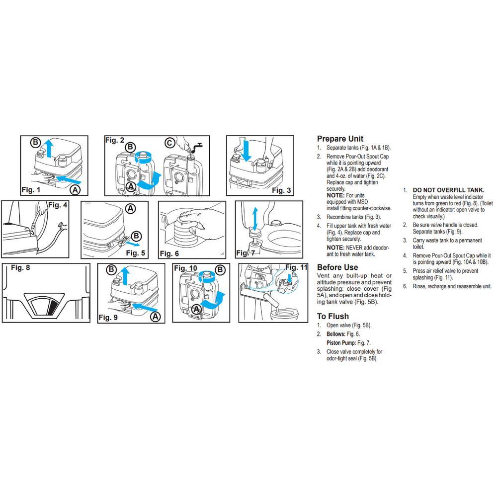 Regular price $145.34Durable toilet is sanitary, odorless, leakproof and easy to clean. The valve handle, fill cap and pump are designed for easy use and good looks. Features include: piston pump, exclusive rotating pour-out spout (92865 only), removable seat and cover for easy cleaning, lid latch, ergonomic water tank carrying handle, sealed valve to keep odors in holding tank, built-in deodorant storage (bottle included), and a hold down kit to secure toilet to deck. MSD model includes connections for direct overboard, dockside pump out, or remote tank discharge. Does not include a pour spout.92865: replaces Model 735 - #2510492868: replaces Model 735 MSD - #25105.