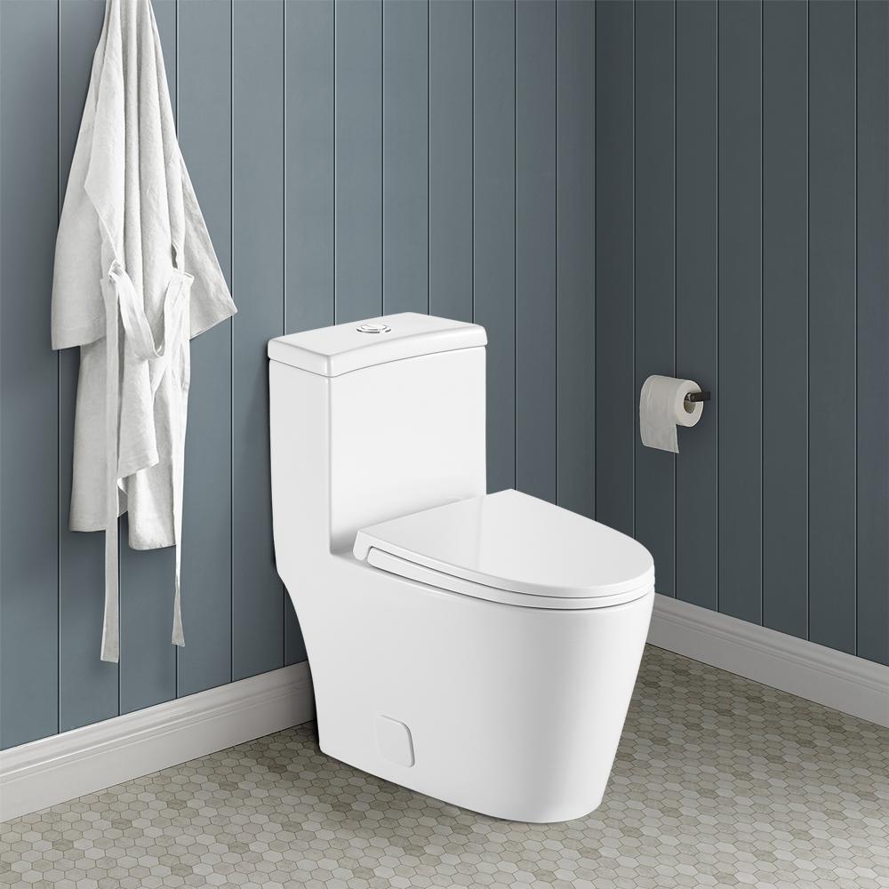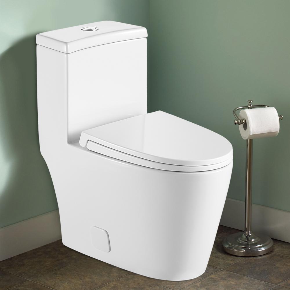 • Dual flush elongated one piece toilet with soft closing seat and round button