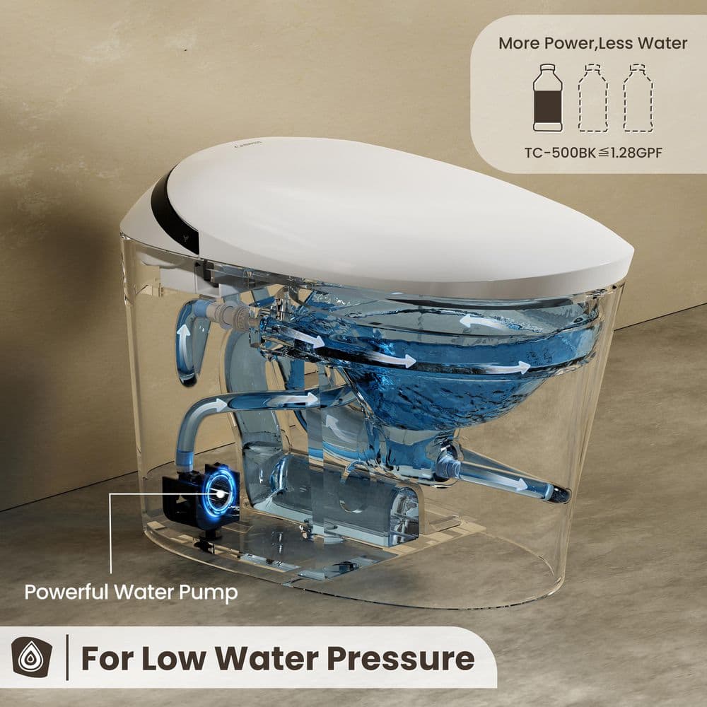 • Efficient Dual Flush: Save water with 1.08/1.45 GPF options and powerful pump-assisted flushing.